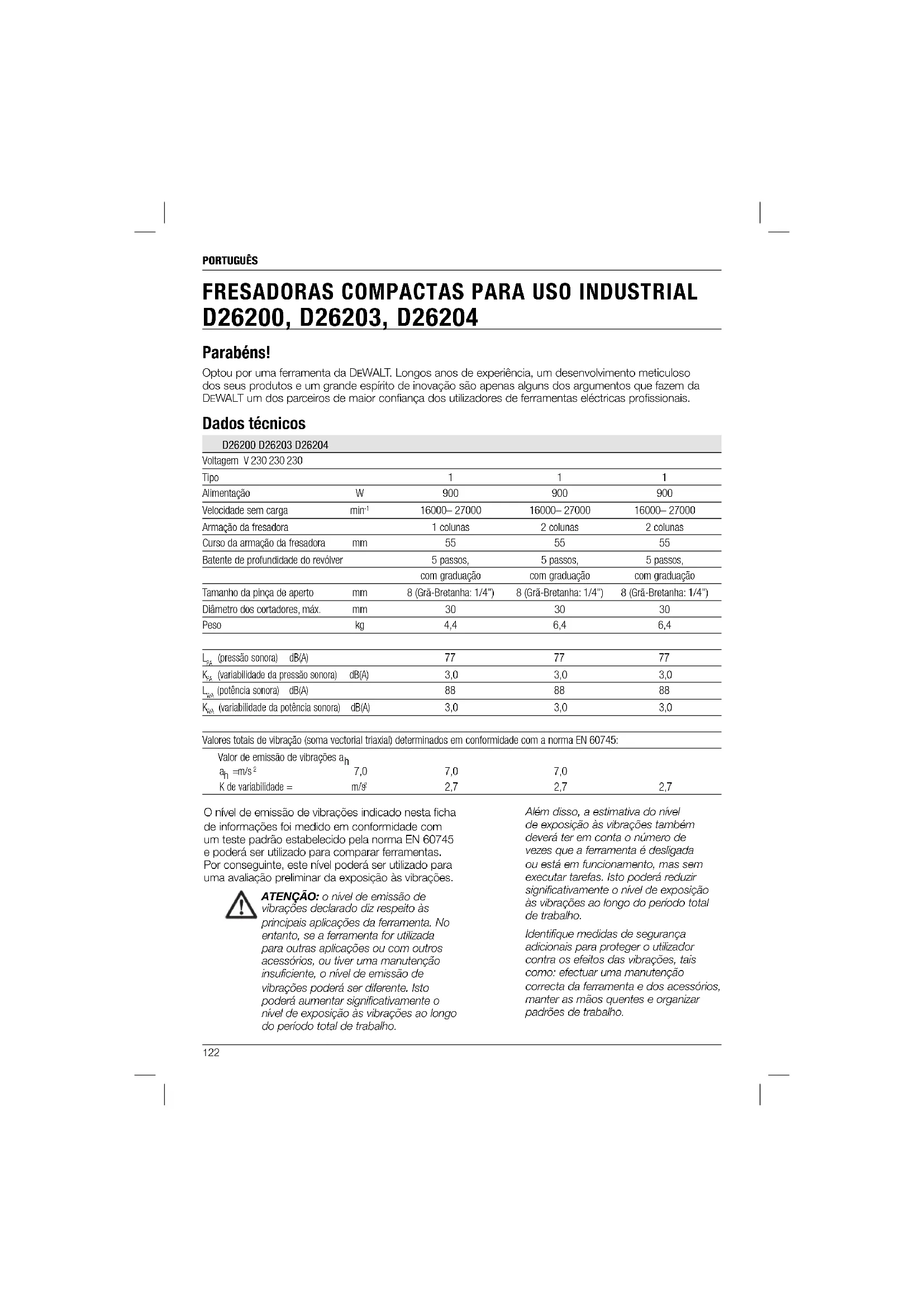D26200, D26203, D26204 Parabéns! Optou por uma ferramenta da DEWALT. Longos anos de experiência, um desenvolvimento meticuloso dos seus produtos e um grande espírito de inovação são apenas alguns dos argumentos que fazem da DEWALT um dos parceiros de maior confiança dos utilizadores de ferramentas eléctricas profissionais. Dados técnicos D26200 D26203 D26204 Voltagem V 230 230 230 Tipo 1 1 1 Alimentação W 900 900 900 Velocidade sem carga min