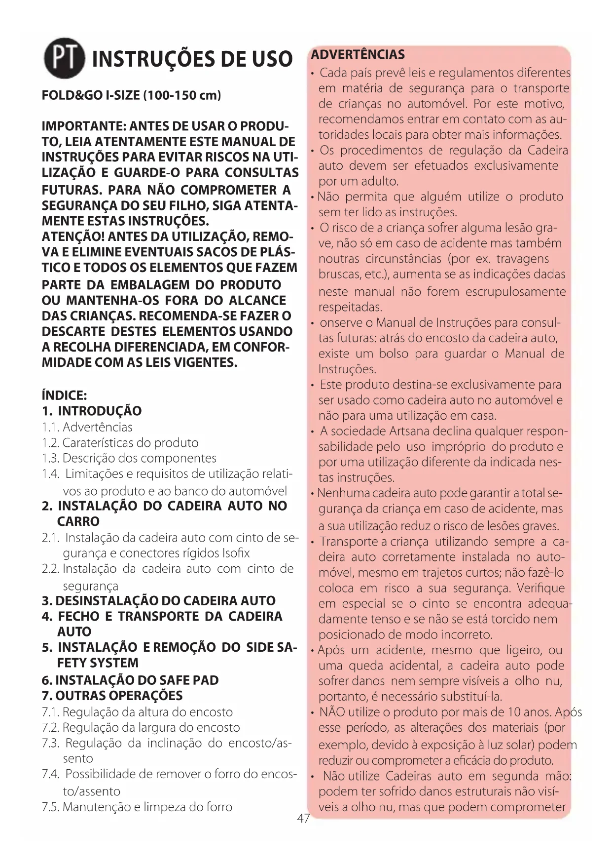 1.1. Advertências 1.2. Caraterísticas do produto 1.3. Descrição dos componentes 1.4. Limitações e requisitos de utilização relati- vos ao produto e ao banco do automóvel