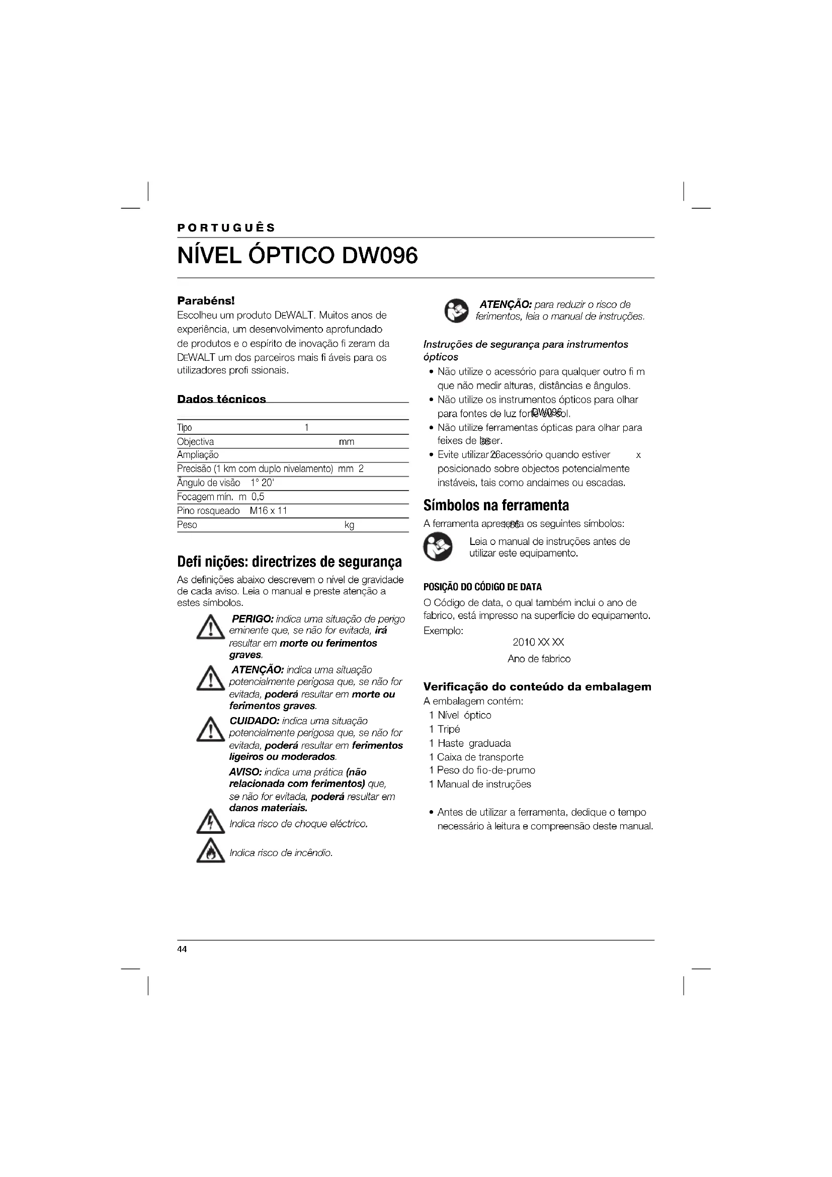 EWALT um dos parceiros mais fi áveis para os utilizadores profi ssionais. Dados técnicos DW096 Tipo 1 Objectiva mm 38 Ampliação 26 x Precisão (1 km com duplo nivelamento) mm 2 Ângulo de visão 1° 20' Focagem mín. m 0,5 Pino rosqueado M16 x 11 Peso kg 1,85 Defi nições: directrizes de segurança As definições abaixo descrevem o nível de gravidade de cada aviso. Leia o manual e preste atenção a estes símbolos. PERIGO: indica uma situação de perigo eminente que, se não for evitada, irá resultar em morte ou ferimentos graves. ATENÇÃO: indica uma situação potencialmente perigosa que, se não for evitada, poderá resultar em morte ou ferimentos graves. CUIDADO: indica uma situação potencialmente perigosa que, se não for evitada, poderá resultar em ferimentos ligeiros ou moderados. AVISO: indica uma prática (não relacionada com ferimentos) que, se não for evitada, poderá resultar em danos materiais. Indica risco de choque eléctrico. Indica risco de incêndio. ATENÇÃO: para reduzir o risco de ferimentos, leia o manual de instruções. Instruções de segurança para instrumentos ópticos