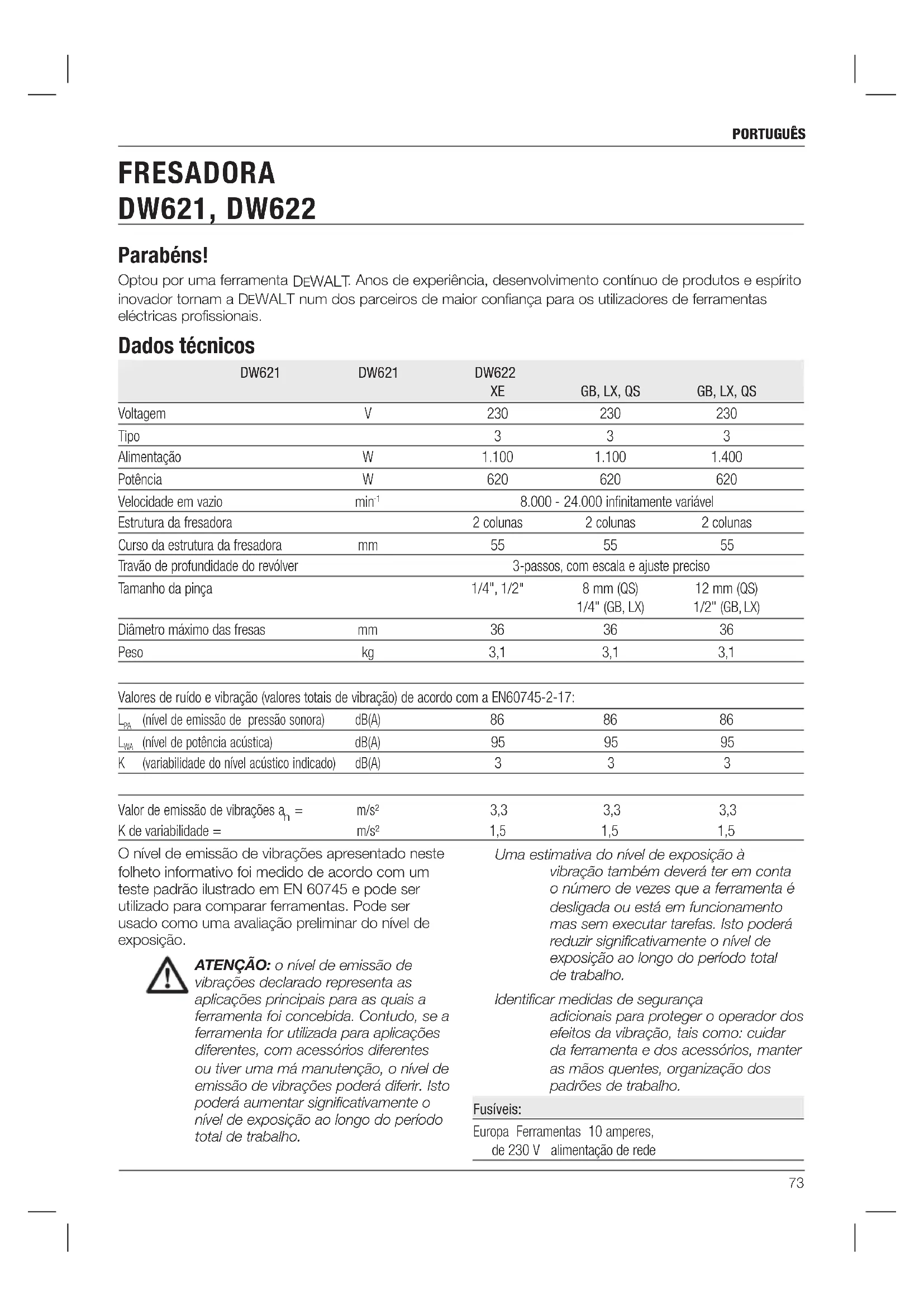 m/s² 3,3 3,3 3,3 K de variabilidade = m/s² 1,5 1,5 1,5 FRESADORA DW621, DW622 Português (traduzido das instruções originais)74 português ATENÇÃO: Para reduzir o risco de ferimentos, leia o manual de instruções. Avisos de Segurança Gerais relativos às Ferramentas Eléctricas ATENÇÃO!: Leia todos os avisos e instruções de segurança. O não seguimento dos avisos e instruções pode resultar em choque eléctrico, incêndio e/ou ferimentos graves. GUARDE TODOS OS AVISOS E INSTRUÇÕES