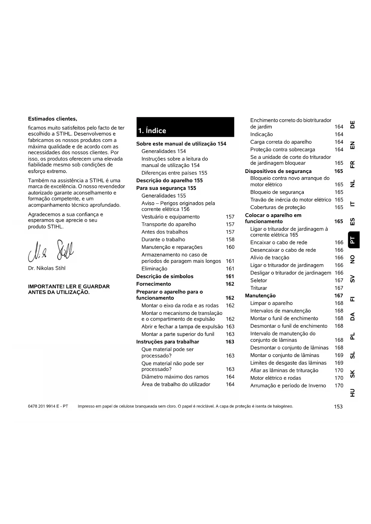 DEENFRNLITESNOSVFIDAPLSLSKHU PT 0478 201 9914 E - PT Estimados clientes, ficamos muito satisfeitos pelo facto de ter escolhido a STIHL. Desenvolvemos e fabricamos os nossos produtos com a máxima qualidade e de acordo com as necessidades dos nossos clientes. Por isso, os produtos oferecem uma elevada fiabilidade mesmo sob condições de esforço extremo. Também na assistência a STIHL é uma marca de excelência. O nosso revendedor autorizado garante aconselhamento e formação competente, e um acompanhamento técnico aprofundado. Agradecemos a sua confiança e esperamos que aprecie o seu produto STIHL. Dr. Nikolas Stihl