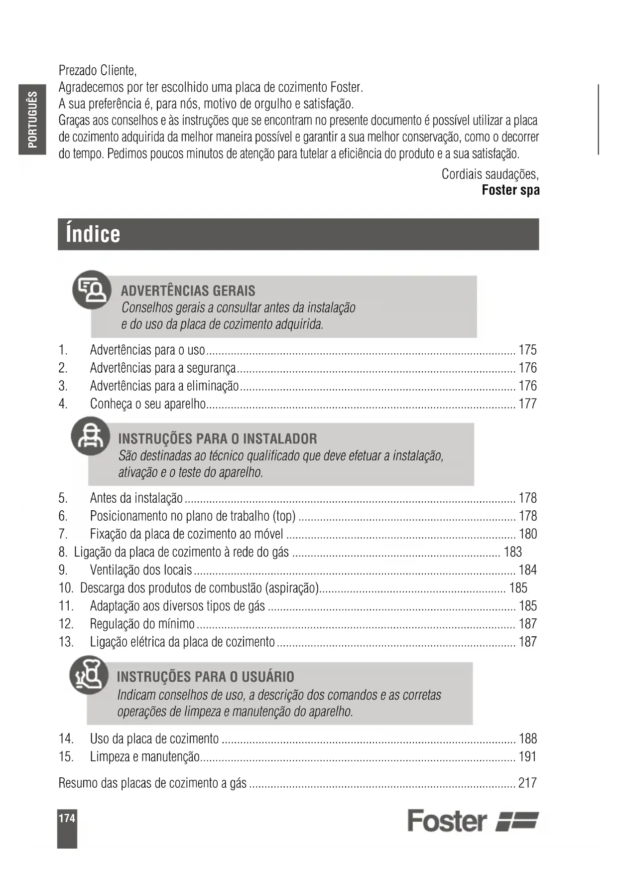 - Resumo das placas de cozimento a gás Prezado Cliente, Agradecemos por ter escolhido uma placa de cozimento Foster. A sua preferência é, para nós, motivo de orgulho e satisfação. Graças aos conselhos e às instruções que se encontram no presente documento é possível utilizar a placa de cozimento adquirida da melhor maneira possível e garantir a sua melhor conservação, como o decorrer do tempo. Pedimos poucos minutos de atenção para tutelar a eficiência do produto e a sua satisfação. Cordiais saudações, Foster spa175 PORTUGUÊS p. 217