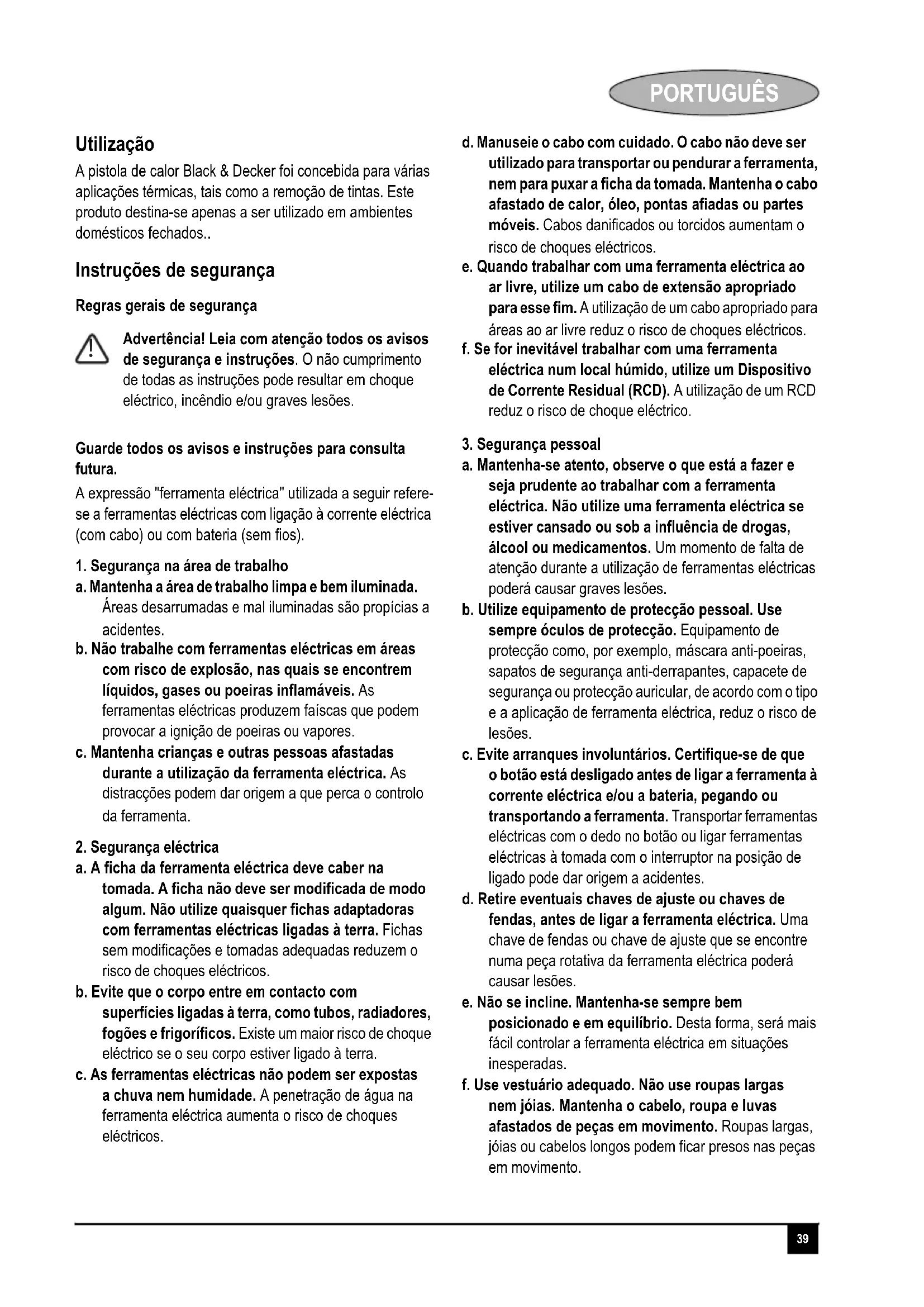 ervicios de posventa y contactos: www.2helpU.com Visite el sitio web www.blackanddecker.eu para registrar su nuevo producto Black & Decker y estar al día sobre productos y ofertas especiales. Encontrará información adicional sobre la marca Black & Decker y nuestra gama de productos en www.blackanddecker.eu.39 PORTUGUÊS Português Utilização A pistola de calor Black & Decker foi concebida para várias aplicações térmicas, tais como a remoção de tintas. Este produto destina-se apenas a ser utilizado em ambientes domésticos fechados.. Instruções de segurança Regras gerais de segurança Guarde todos os avisos e instruções para consulta futura. A expressão "ferramenta eléctrica" utilizada a seguir refere- se a ferramentas eléctricas com ligação à corrente eléctrica (com cabo) ou com bateria (sem fios).