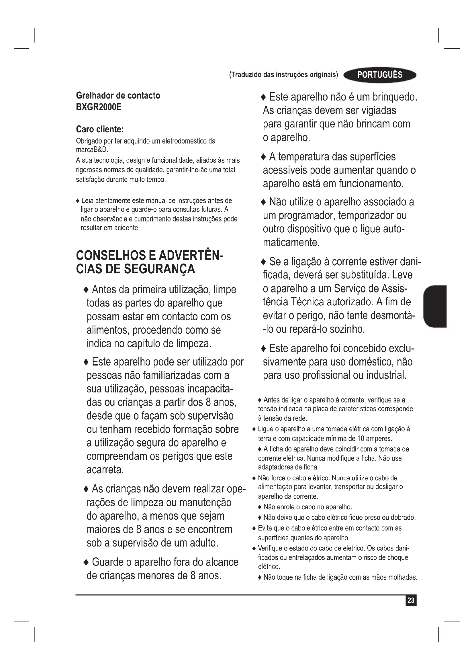 Grelhador de contacto BXGR2000E Caro cliente: Obrigado por ter adquirido um eletrodoméstico da marcaB&D. A sua tecnologia, design e funcionalidade, aliados às mais rigorosas normas de qualidade, garantir-lhe-ão uma total satisfação durante muito tempo. ♦ Leia atentamente este manual de instruções antes de ligar o aparelho e guarde-o para consultas futuras. A não observância e cumprimento destas instruções pode resultar em acidente.