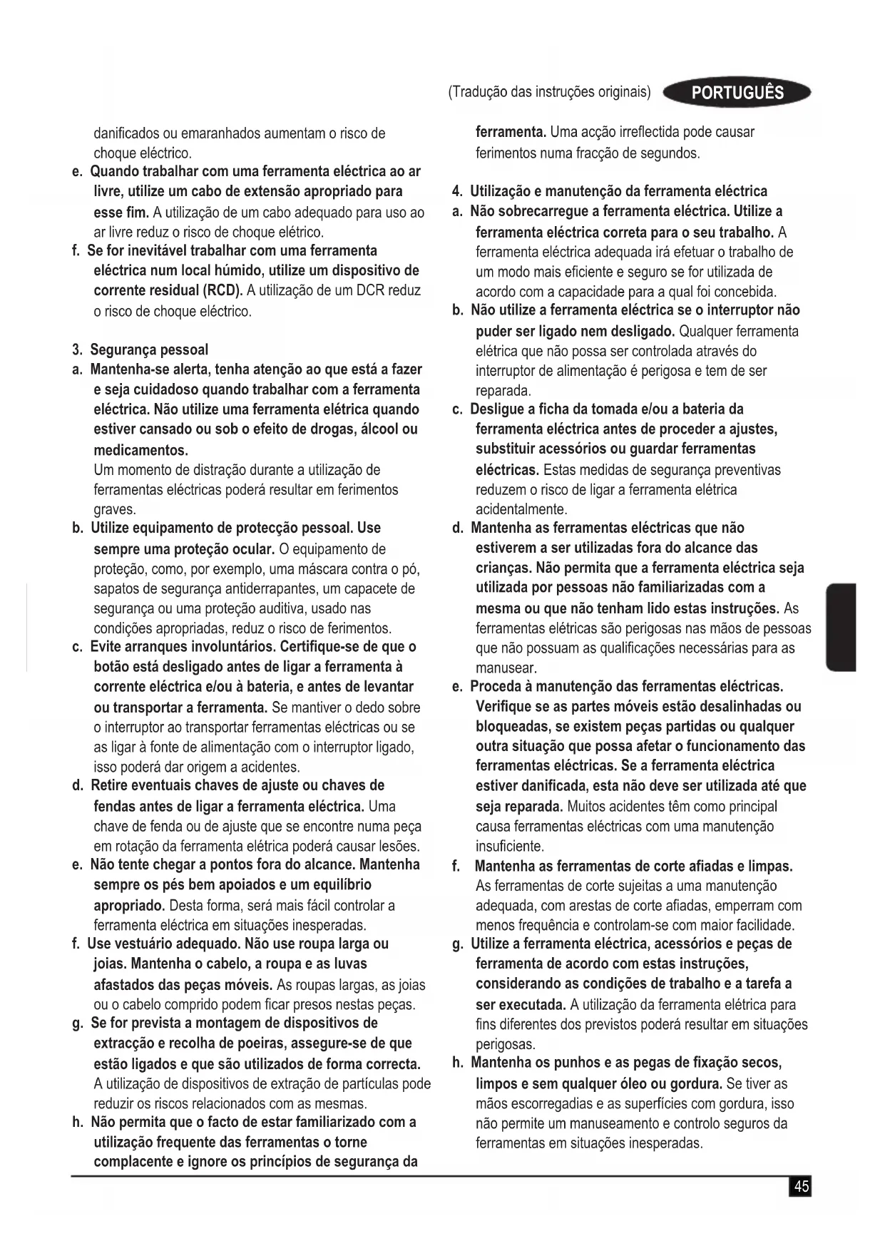 a. Não sobrecarregue a ferramenta eléctrica. Utilize a ferramenta eléctrica correta para o seu trabalho. A ferramenta eléctrica adequada irá efetuar o trabalho de um modo mais eciente e seguro se for utilizada de acordo com a capacidade para a qual foi concebida. b. Não utilize a ferramenta eléctrica se o interruptor não puder ser ligado nem desligado. Qualquer ferramenta elétrica que não possa ser controlada através do interruptor de alimentação é perigosa e tem de ser reparada. c. Desligue a cha da tomada e/ou a bateria da ferramenta eléctrica antes de proceder a ajustes, substituir acessórios ou guardar ferramentas eléctricas. Estas medidas de segurança preventivas reduzem o risco de ligar a ferramenta elétrica acidentalmente. d. Mantenha as ferramentas eléctricas que não estiverem a ser utilizadas fora do alcance das crianças. Não permita que a ferramenta eléctrica seja utilizada por pessoas não familiarizadas com a mesma ou que não tenham lido estas instruções. As ferramentas elétricas são perigosas nas mãos de pessoas que não possuam as qualicações necessárias para as manusear. e. Proceda à manutenção das ferramentas eléctricas. Verique se as partes móveis estão desalinhadas ou bloqueadas, se existem peças partidas ou qualquer outra situação que possa afetar o funcionamento das ferramentas eléctricas. Se a ferramenta eléctrica estiver danicada, esta não deve ser utilizada até que seja reparada. Muitos acidentes têm como principal causa ferramentas eléctricas com uma manutenção insuciente. f. Mantenha as ferramentas de corte aadas e limpas. As ferramentas de corte sujeitas a uma manutenção adequada, com arestas de corte aadas, emperram com menos frequência e controlam-se com maior facilidade. g. Utilize a ferramenta eléctrica, acessórios e peças de ferramenta de acordo com estas instruções, considerando as condições de trabalho e a tarefa a ser executada. A utilização da ferramenta elétrica para ns diferentes dos previstos poderá resultar em situações perigosas. h. Mantenha os punhos e as pegas de xação secos, limpos e sem qualquer óleo ou gordura. Se tiver as mãos escorregadias e as superfícies com gordura, isso não permite um manuseamento e controlo seguros da ferramentas em situações inesperadas. danicados ou emaranhados aumentam o risco de choque eléctrico. e. Quando trabalhar com uma ferramenta eléctrica ao ar livre, utilize um cabo de extensão apropriado para esse m. A utilização de um cabo adequado para uso ao ar livre reduz o risco de choque elétrico. f. Se for inevitável trabalhar com uma ferramenta eléctrica num local húmido, utilize um dispositivo de corrente residual (RCD). A utilização de um DCR reduz o risco de choque eléctrico.