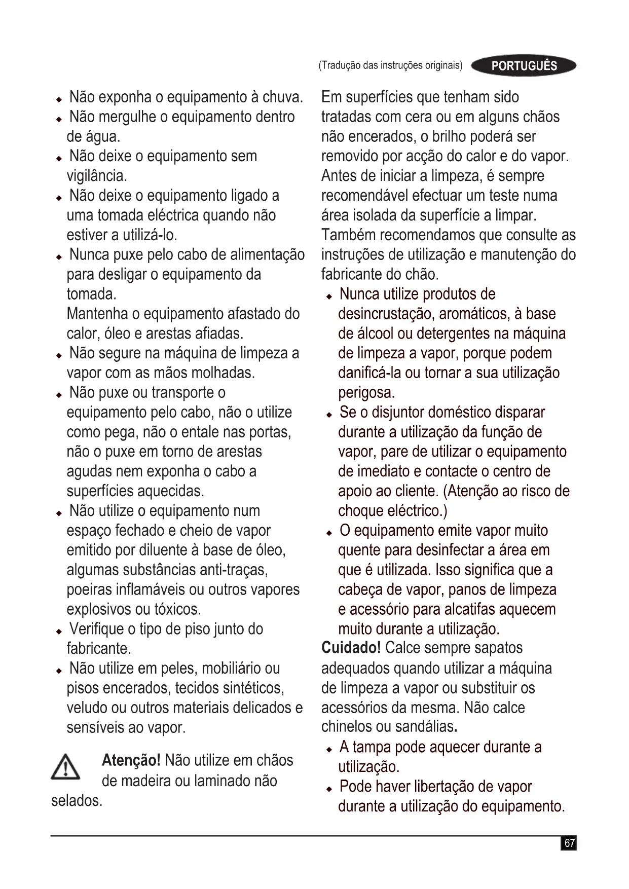 a execução de qualquer operação com este equipamento que não esteja incluída no presente manual de instruções pode representar um risco de ferimentos. u Guarde este manual para referência futura. Utilizar o equipamento u Não aponte o vapor directamente para pessoas, animais, electrodomésticos ou tomadas eléctricas.67 (Tradução das instruções originais) PORTUGUÊS u Não exponha o equipamento à chuva. u Não mergulhe o equipamento dentro de água. u Não deixe o equipamento sem vigilância. u Não deixe o equipamento ligado a uma tomada eléctrica quando não estiver a utilizá-lo. u Nunca puxe pelo cabo de alimentação para desligar o equipamento da tomada. Mantenha o equipamento afastado do calor,óleoearestasaadas. u Não segure na máquina de limpeza a vapor com as mãos molhadas. u Não puxe ou transporte o equipamento pelo cabo, não o utilize como pega, não o entale nas portas, não o puxe em torno de arestas agudas nem exponha o cabo a superfícies aquecidas. u Não utilize o equipamento num espaço fechado e cheio de vapor emitido por diluente à base de óleo, algumas substâncias anti-traças, poeirasinamáveisououtrosvapores explosivos ou tóxicos. u Veriqueotipodepisojuntodo fabricante. u Não utilize em peles, mobiliário ou pisos encerados, tecidos sintéticos, veludo ou outros materiais delicados e sensíveis ao vapor. Atenção! Não utilize em chãos de madeira ou laminado não selados. Em superfícies que tenham sido tratadas com cera ou em alguns chãos não encerados, o brilho poderá ser removido por acção do calor e do vapor. Antes de iniciar a limpeza, é sempre recomendável efectuar um teste numa área isolada da superfície a limpar. Também recomendamos que consulte as instruções de utilização e manutenção do fabricante do chão. u Nunca utilize produtos de desincrustação, aromáticos, à base de álcool ou detergentes na máquina de limpeza a vapor, porque podem danicá-laoutornarasuautilização perigosa. u Se o disjuntor doméstico disparar durante a utilização da função de vapor, pare de utilizar o equipamento de imediato e contacte o centro de apoio ao cliente. (Atenção ao risco de choque eléctrico.) u Oequipamentoemitevapormuito quente para desinfectar a área em queéutilizada.Issosignicaquea cabeça de vapor, panos de limpeza e acessório para alcatifas aquecem muito durante a utilização. Cuidado! Calce sempre sapatos adequados quando utilizar a máquina de limpeza a vapor ou substituir os acessórios da mesma. Não calce chinelos ou sandálias. u A tampa pode aquecer durante a utilização. u Pode haver libertação de vapor durante a utilização do equipamento.68 (Tradução das instruções originais) PORTUGUÊS Deve ter cuidado quando utilizar o equipamento.NÃOtoqueem nenhuma peça que possa aquecer durante a utilização. u Desligue o equipamento e volte a colocar a pega na posição vertical antes de remover o reservatório de água. u Severicarquehálibertaçãodevapor do corpo da máquina de limpeza a vapor manual, desligue-a, retire achadaunidadedaalimentação principal e deixe-a arrefecer. Contacte o técnico de reparação autorizado mais próximo. Não continue a utilizar o equipamento. Após a utilização u Retireachadamáquinaedeixe-a arrefecer antes de limpá-la. u Quando não estiver a ser utilizado, o equipamento deve ser guardado num local seco. u As crianças não devem ter acesso a equipamentos armazenados. Inspecção e reparações u Antes de proceder a qualquer manutenção ou reparação, retire a chadoequipamentodatomadae deixe-a arrefecer. u Antesdautilizaçãoveriquesehá peçasdanicadasouavariadasno equipamento.Veriquesehápeças partidas, danos nos interruptores ou outro tipo de situações que possam afectar o funcionamento. u Veriquecomfrequênciaseocabode alimentação apresenta danos. u Não utilize este equipamento se algumadaspeçasestiverdanicada ou avariada. u Mande reparar ou substituir quaisquer peçasdanicadasouavariadaspor um técnico de reparação autorizado. u Nunca retire ou substitua quaisquer peçasquenãosejamasespecicadas neste manual. Segurança de terceiros u Este equipamento pode ser utilizado por pessoas que apresentem capacidades físicas, sensoriais ou mentais reduzidas ou que não possuam os conhecimentos e a experiência necessários, se forem vigiadas e instruídas acerca da utilização do equipamento em segurança e compreenderem os perigos envolvidos. As crianças não devem mexer no equipamento. u As crianças devem ser vigiadas para garantir que não mexem no equipamento. u Antes de proceder à limpeza ou manutenção do equipamento, deve retirarachadatomadaeléctrica. u Olíquidoouovapornãodevemser direccionados para equipamento que contenha componentes eléctricos, como, por exemplo, o interior de fornos. u Oequipamentonãodevepermanecer sem assistência quando estiver ligado à alimentação.69 (Tradução das instruções originais) PORTUGUÊS u Oequipamentonãodeveserutilizado se tiver sofrido uma queda, se houver sinais visíveis de danos ou se tiver fugas. u Mantenha o equipamento afastado do alcance das crianças quando estiver a carregar ou a arrefecer. u Nunca aponte ou direccione a máquina de limpeza a vapor na sua direcção ou de outra pessoa. u Deve-se tomar cuidado ao usar o aparelho devido à emissão de vapor. u Desligue o aparelho durante o enchimento e a limpeza. u Ovaporizadordetecidonãodeve ser deixado sem vigilância enquanto estiver conectado à rede elétrica. u Ovaporizadordetecidonãodeve ser usado se tiver caído, se houver sinais visíveis de danos ou se houver vazamento. u Mantenhaovapordotecidoeoo fora do alcance de crianças com menos de 8 anos de idade quando estiver energizado ou esfriando Riscos residuais Podem surgir riscos residuais adicionais durante a utilização da ferramenta, que podem não constar nos avisos de segurança incluídos. Estes riscos podem resultar de má utilização, uso prolongado, etc. Mes
