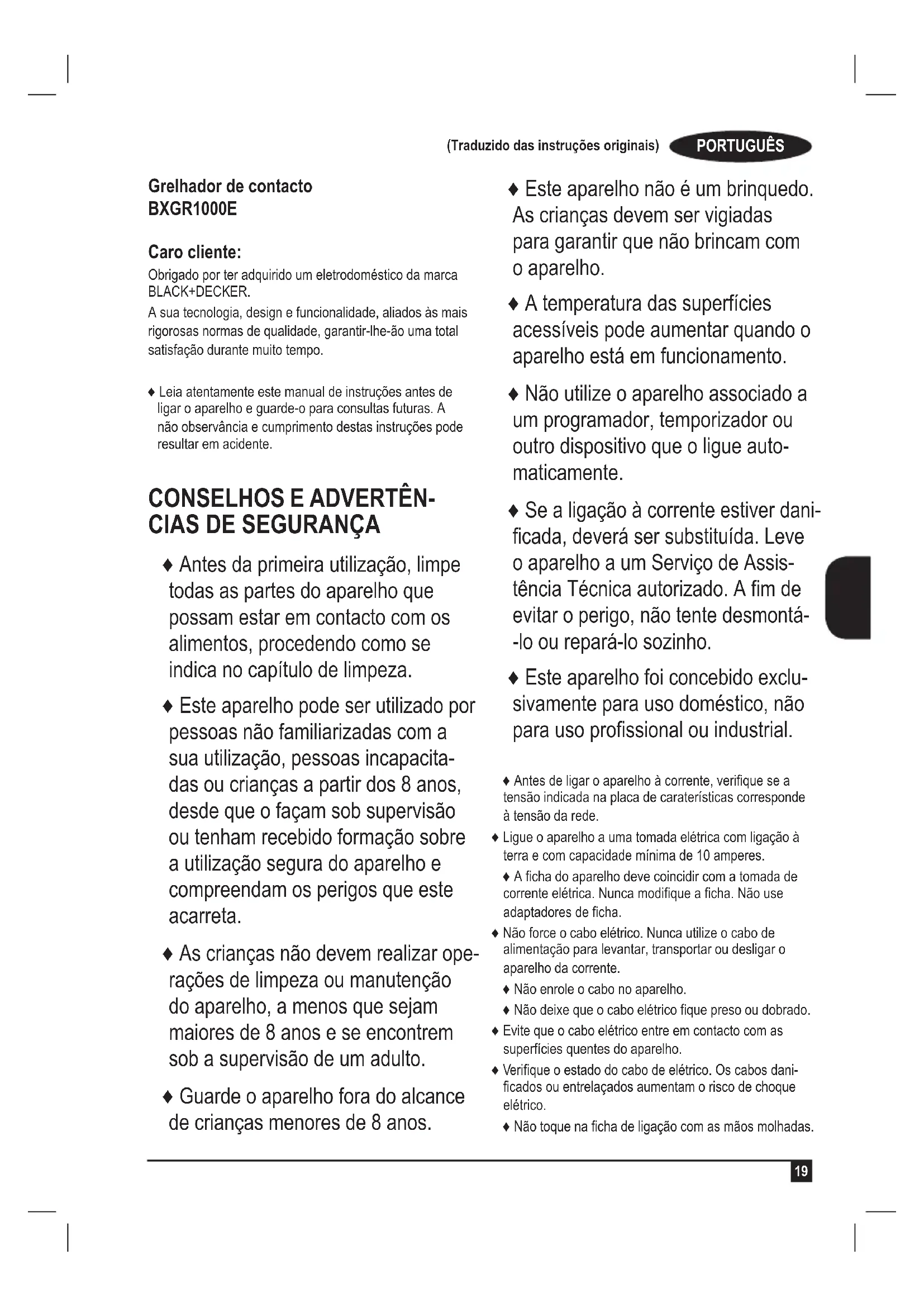 Grelhador de contacto BXGR1000E Caro cliente: Obrigado por ter adquirido um eletrodoméstico da marca BLACK+DECKER. A sua tecnologia, design e funcionalidade, aliados às mais rigorosas normas de qualidade, garantir-lhe-ão uma total satisfação durante muito tempo. ♦ Leia atentamente este manual de instruções antes de ligar o aparelho e guarde-o para consultas futuras. A não observância e cumprimento destas instruções pode resultar em acidente.