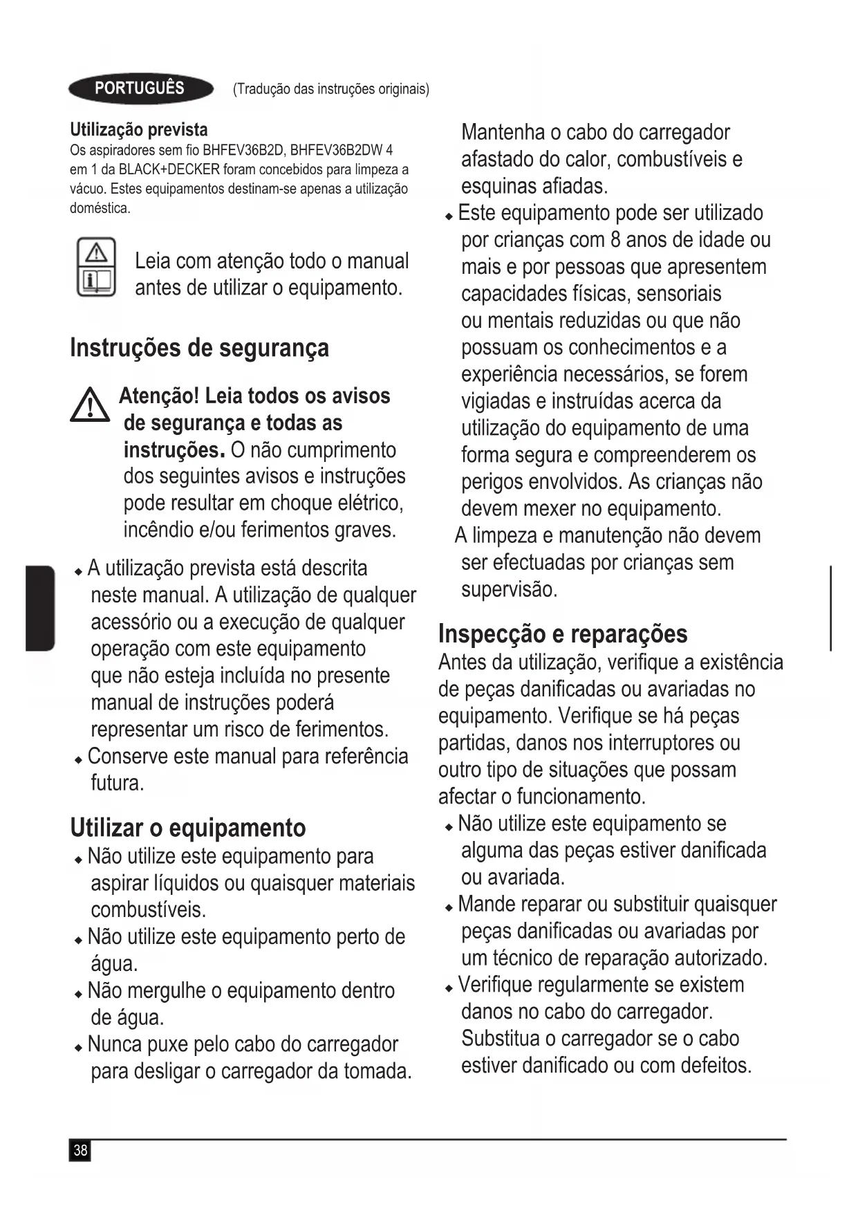 Atenção! Leia todos os avisos de segurança e todas as instruções. O não cumprimento dos seguintes avisos e instruções pode resultar em choque elétrico, incêndio e/ou ferimentos graves. u A utilização prevista está descrita neste manual. A utilização de qualquer acessório ou a execução de qualquer operação com este equipamento que não esteja incluída no presente manual de instruções poderá representar um risco de ferimentos. u Conserve este manual para referência futura. Utilizar o equipamento u Não utilize este equipamento para aspirar líquidos ou quaisquer materiais combustíveis. u Não utilize este equipamento perto de água. u Não mergulhe o equipamento dentro de água. u Nunca puxe pelo cabo do carregador para desligar o carregador da tomada. Mantenha o cabo do carregador afastado do calor, combustíveis e esquinas aadas. u Este equipamento pode ser utilizado por crianças com 8 anos de idade ou mais e por pessoas que apresentem capacidades físicas, sensoriais ou mentais reduzidas ou que não possuam os conhecimentos e a experiência necessários, se forem vigiadas e instruídas acerca da utilização do equipamento de uma forma segura e compreenderem os perigos envolvidos. As crianças não devem mexer no equipamento. A limpeza e manutenção não devem ser efectuadas por crianças sem supervisão. Inspecção e reparações Antes da utilização, verique a existência de peças danicadas ou avariadas no equipamento. Verique se há peças partidas, danos nos interruptores ou outro tipo de situações que possam afectar o funcionamento. u Não utilize este equipamento se alguma das peças estiver danicada ou avariada. u Mande reparar ou substituir quaisquer peças danicadas ou avariadas por um técnico de reparação autorizado. u Verique regularmente se existem danos no cabo do carregador. Substitua o carregador se o cabo estiver danicado ou com defeitos.39 (Tradução das instruções originais) PORTUGUÊS u Nunca tente retirar ou substituir quaisquer peças que não sejam as especicadas neste manual. Instruções de segurança adicionais Após a utilização u Desligue o carregador ou a base de carga antes de os limpar. u Quando não estiver a ser utilizado, o equipamento deve ser guardado num local seco. u As crianças não devem ter acesso a equipamentos armazenados. Riscos residuais Podem surgir riscos residuais adicionais durante a utilização da ferramenta, que podem não constar nos avisos de segurança incluídos. Estes riscos podem resultar de má utilização, uso prolongado, etc. Mesmo com o cumprimento dos regulamentos de segurança relevantes e a implementação de dispositivos de segurança, alguns riscos residuais não podem ser evitados. Estes incluem: u Ferimentos causados pelo contacto com peças em rotação/movimento. u Ferimentos causados durante a substituição de peças, lâminas ou acessórios. u Ferimentos causados pela utilização prolongada de uma ferramenta. Se utilizar uma ferramenta durante períodos prolongados, certique-se de que faz pausas regularmente. u Danos auditivos.u Problemas de saúde causados pela inalação de poeiras resultantes da utilização da ferramenta (exemplo: trabalhos em madeira, especialmente carvalho, faia e MDF). Carregadores O carregador foi concebido para uma tensão especíca. Verique sempre se a tensão de alimentação corresponde à tensão indicada na placa sinaléctica. Atenção! Nunca tente substituir a unidade do carregador por uma tomada de alimentação normal. u Utilize o carregador BLACK+DECKER apenas para carregar a bateria do equipamento com que foi fornecido. Outras baterias podem rebentar, provocando ferimentos e danos. u Nunca tente carregar baterias não recarregáveis. u Se o cabo de alimentação estiver danicado, terá de ser substituído pelo fabricante ou por um Centro de Assistência autorizado da BLACK+DECKER, de modo a evitar situações de perigo. u Não exponha o carregador à água.u Não abra o carregador.u Não perfure o carregador.u O equipamento/bateria deve ser colocado numa área com boa ventilação durante o carregamento. Segurança eléctrica Símbolos no carregador