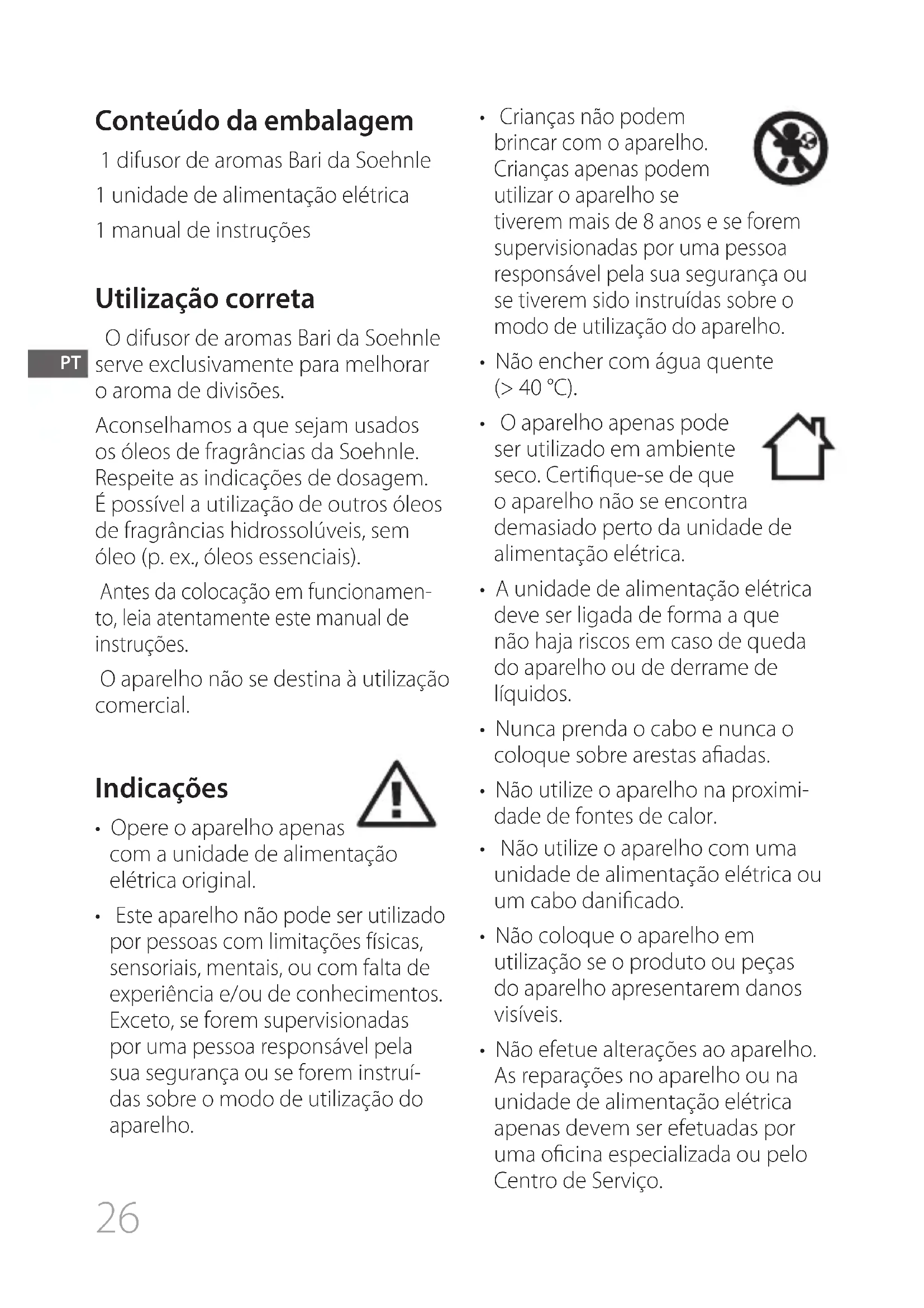 No hay vapor El cable no está conectado Conecte el cable en el enchufe y en el dispositivo Hay poca agua en el depósito Rellene con agua hasta la marca Hay demasiada agua en el depósito Vacíe agua hasta la marca La parte superior está bloqueada por una película de agua o por otro objeto Límpiela con un paño El depósito está sucio Limpie el depósito con un paño y con bastoncillos de algodón Datos técnicos N.º de artículo 68111 Dimensiones Ø 115 x 146,2 mm Tensión nominal 24 V Potencia nominal 9 W Capacidad del depósito 80 ml Enchufe Modelo: K09S240037G Entrada: 100-240 V - 50/60 Hz 0,5 A Salida: 24,0 V = 0,37 A E26 Conteúdo da embalagem 1 difusor de aromas Bari da Soehnle 1 unidade de alimentação elétrica 1 manual de instruções Utilização correta O difusor de aromas Bari da Soehnle serve exclusivamente para melhorar o aroma de divisões. Aconselhamos a que sejam usados os óleos de fragrâncias da Soehnle. Respeite as indicações de dosagem. É possível a utilização de outros óleos de fragrâncias hidrossolúveis, sem óleo (p. ex., óleos essenciais). Antes da colocação em funcionamen- to, leia atentamente este manual de instruções. O aparelho não se destina à utilização comercial. Indicações
