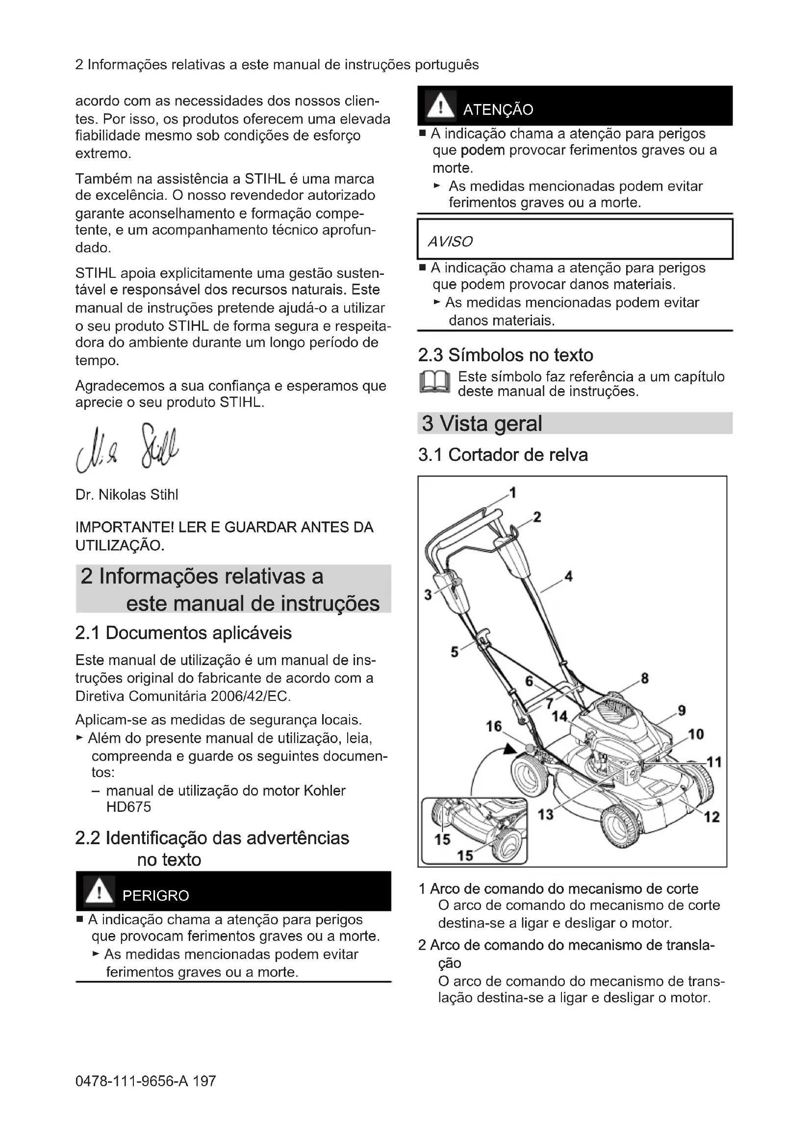 - 22 Declaração de conformidade CE 1 Prefácio Estimados clientes, ficamos muito satisfeitos pelo facto de ter esco‐ lhido a STIHL. Desenvolvemos e fabricamos os nossos produtos com a máxima qualidade e de português 21 Ártalmatlanítás 196 0478-111-9656-A © ANDREAS STIHL AG & Co. KG 2022 0478-111-9656-A. VA2.B22. Impresso em papel, branqueado sem cloro. As tintas de imprensa contêm óleos vegetais, o papel é reciclável. Tradução do manual de instruções original 0000009472_006_Pacordo com as necessidades dos nossos clien‐ tes. Por isso, os produtos oferecem uma elevada fiabilidade mesmo sob condições de esforço extremo. Também na assistência a STIHL é uma marca de excelência. O nosso revendedor autorizado garante aconselhamento e formação compe‐ tente, e um acompanhamento técnico aprofun‐ dado. STIHL apoia explicitamente uma gestão susten‐ tável e responsável dos recursos naturais. Este manual de instruções pretende ajudá-o a utilizar o seu produto STIHL de forma segura e respeita‐ dora do ambiente durante um longo período de tempo. Agradecemos a sua confiança e esperamos que aprecie o seu produto STIHL. Dr. Nikolas Stihl p. 213