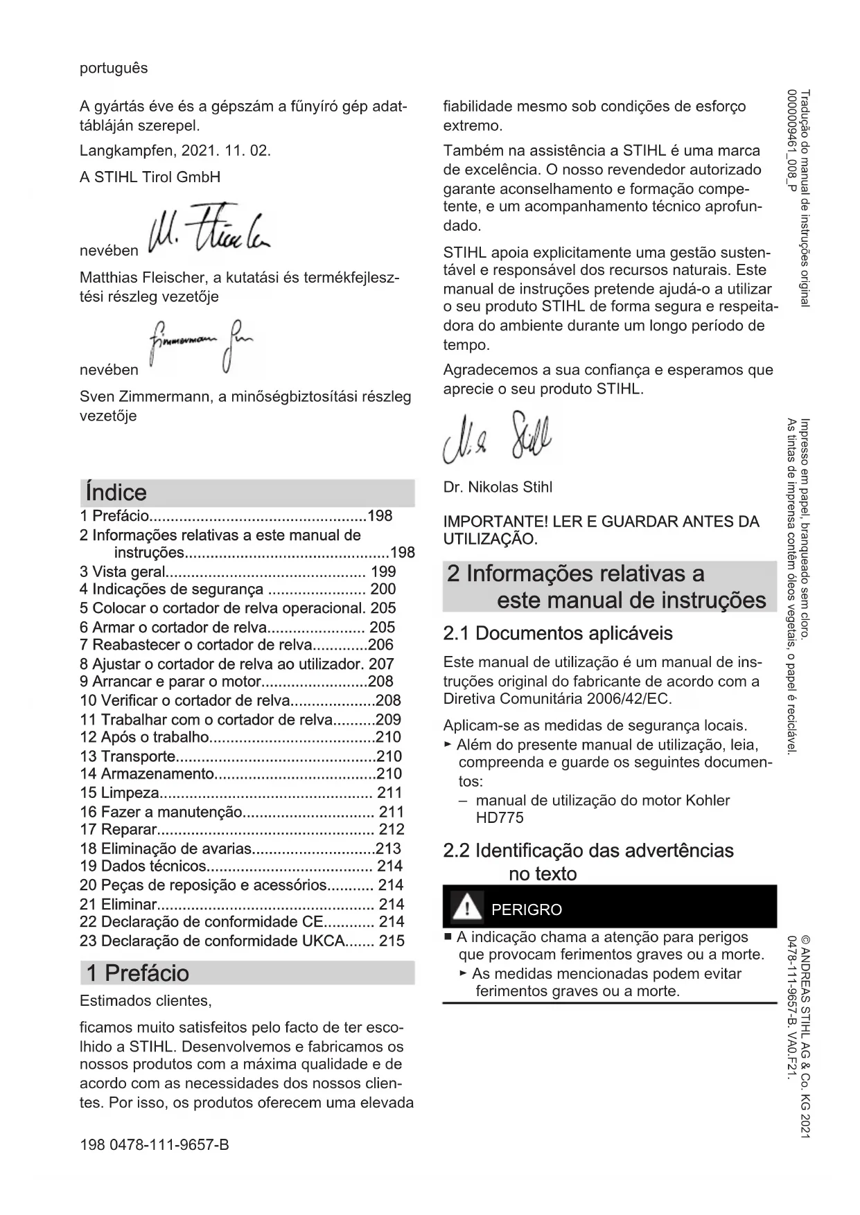 - 23 Declaração de conformidade UKCA 1 Prefácio Estimados clientes, ficamos muito satisfeitos pelo facto de ter esco‐ lhido a STIHL. Desenvolvemos e fabricamos os nossos produtos com a máxima qualidade e de acordo com as necessidades dos nossos clien‐ tes. Por isso, os produtos oferecem uma elevada fiabilidade mesmo sob condições de esforço extremo. Também na assistência a STIHL é uma marca de excelência. O nosso revendedor autorizado garante aconselhamento e formação compe‐ tente, e um acompanhamento técnico aprofun‐ dado. STIHL apoia explicitamente uma gestão susten‐ tável e responsável dos recursos naturais. Este manual de instruções pretende ajudá-o a utilizar o seu produto STIHL de forma segura e respeita‐ dora do ambiente durante um longo período de tempo. Agradecemos a sua confiança e esperamos que aprecie o seu produto STIHL. Dr. Nikolas Stihl p. 215