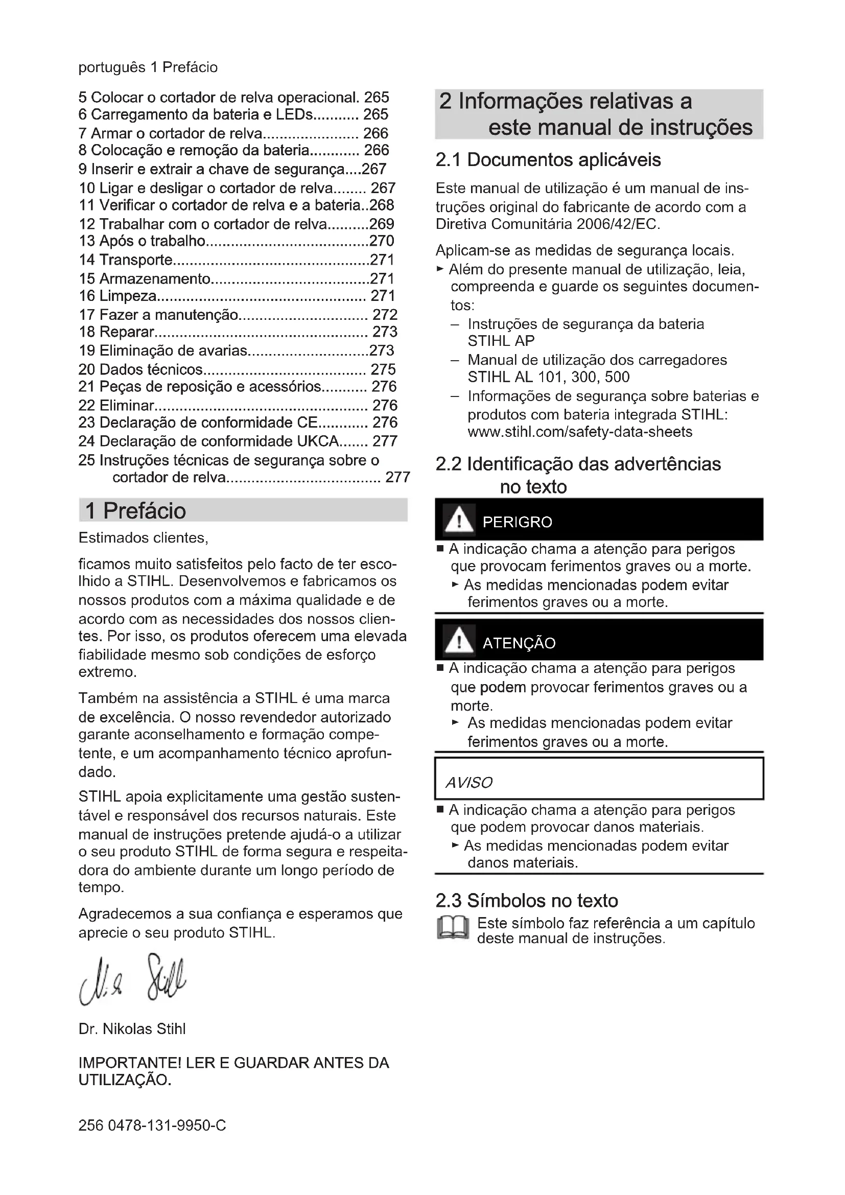 - 25 Instruções técnicas de segurança sobre o cortador de relva 1 Prefácio Estimados clientes, ficamos muito satisfeitos pelo facto de ter esco‐ lhido a STIHL. Desenvolvemos e fabricamos os nossos produtos com a máxima qualidade e de acordo com as necessidades dos nossos clien‐ tes. Por isso, os produtos oferecem uma elevada fiabilidade mesmo sob condições de esforço extremo. Também na assistência a STIHL é uma marca de excelência. O nosso revendedor autorizado garante aconselhamento e formação compe‐ tente, e um acompanhamento técnico aprofun‐ dado. STIHL apoia explicitamente uma gestão susten‐ tável e responsável dos recursos naturais. Este manual de instruções pretende ajudá-o a utilizar o seu produto STIHL de forma segura e respeita‐ dora do ambiente durante um longo período de tempo. Agradecemos a sua confiança e esperamos que aprecie o seu produto STIHL. Dr. Nikolas Stihl p. 277