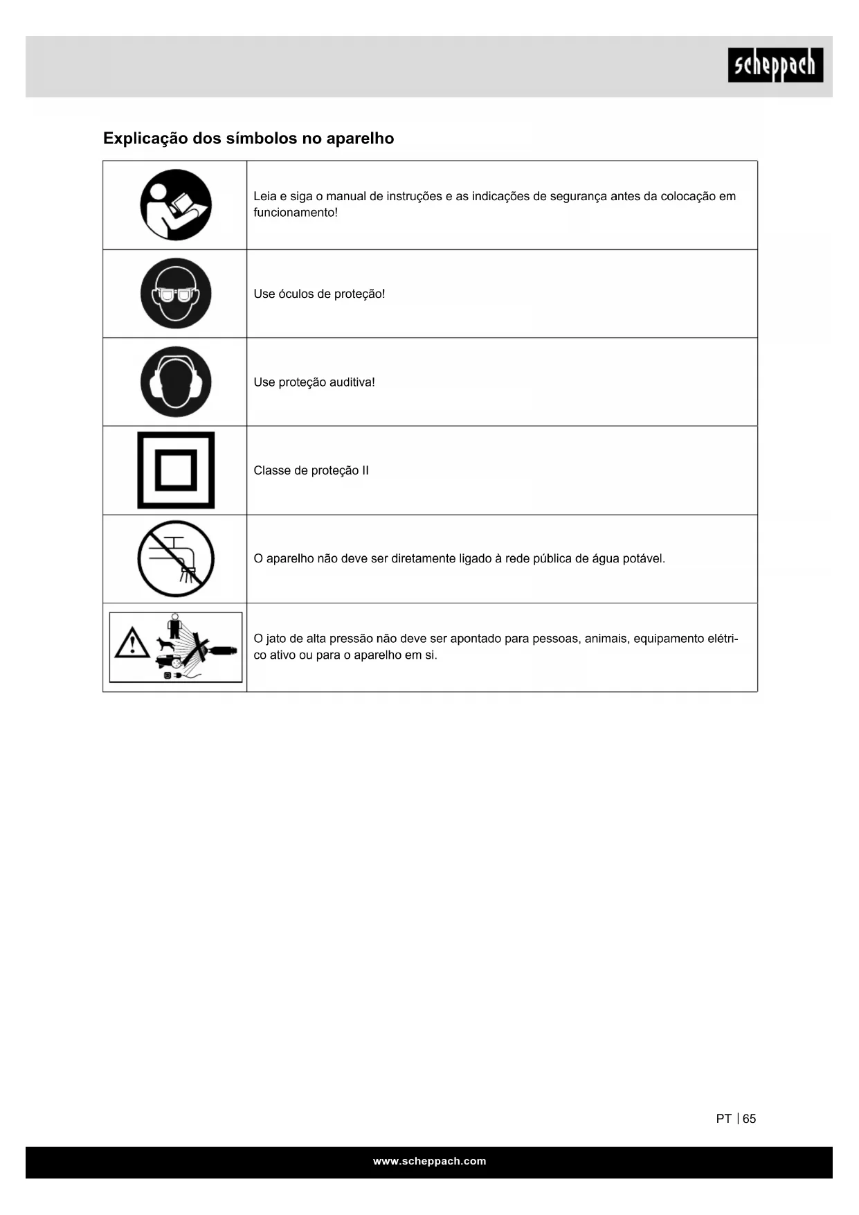 Explicação dos símbolos no aparelho Leia e siga o manual de instruções e as indicações de segurança antes da colocação em funcionamento! Use óculos de proteção! Use proteção auditiva! Classe de proteção II O aparelho não deve ser diretamente ligado à rede pública de água potável. O jato de alta pressão não deve ser apontado para pessoas, animais, equipamento elétri- co ativo ou para o aparelho em si.www.scheppach.com