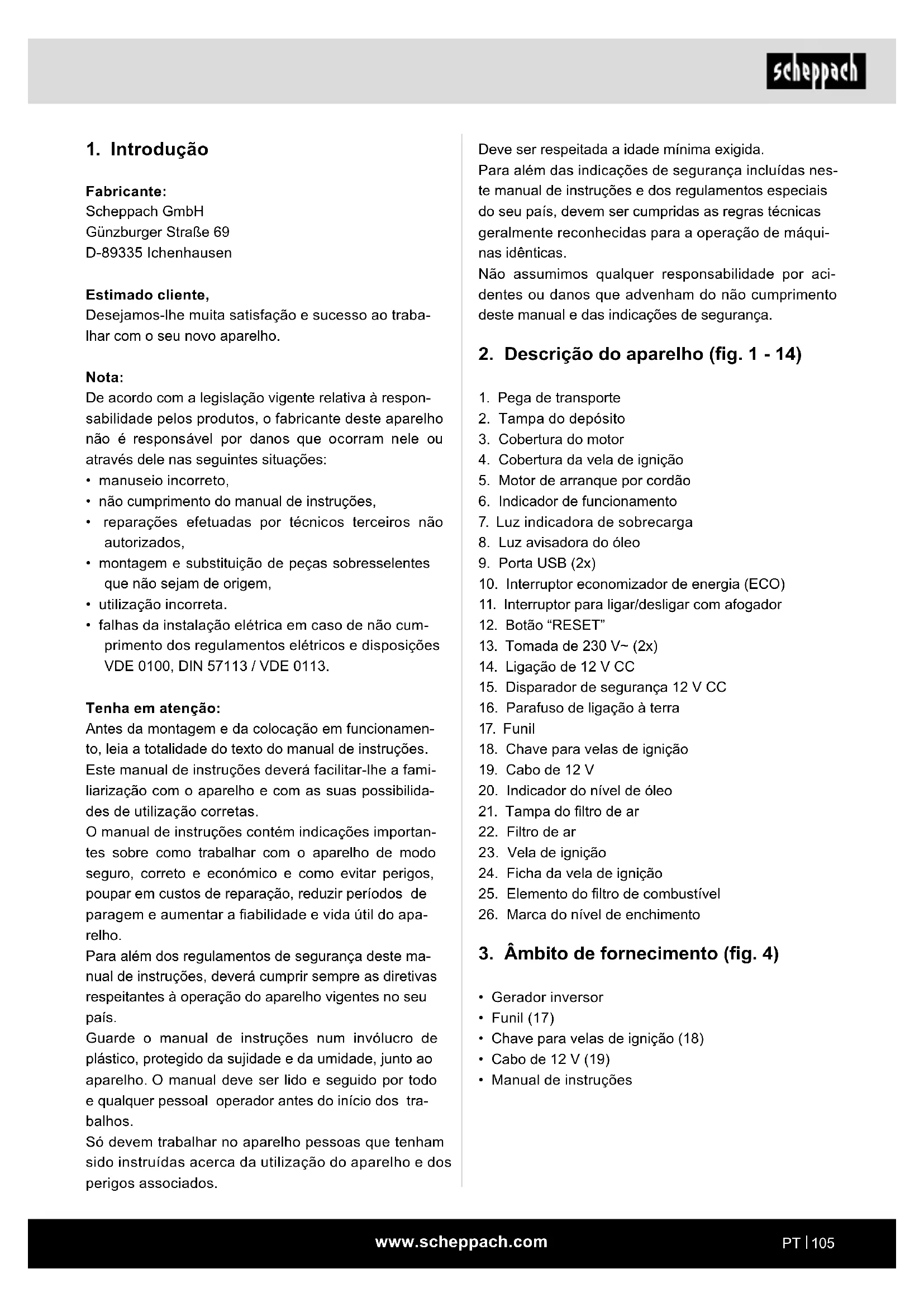 - falhas da instalação elétrica em caso de não cum- primento dos regulamentos elétricos e disposições VDE 0100, DIN 57113 / VDE 0113. Tenha em atenção: Antes da montagem e da colocação em funcionamen- to, leia a totalidade do texto do manual de instruções. Este manual de instruções deverá facilitar-lhe a fami- liarização com o aparelho e com as suas possibilida- des de utilização corretas. O manual de instruções contém indicações importan- tes sobre como trabalhar com o aparelho de modo seguro, correto e económico e como evitar perigos, poupar em custos de reparação, reduzir períodos de paragem e aumentar a abilidade e vida útil do apa- relho. Para além dos regulamentos de segurança deste ma- nual de instruções, deverá cumprir sempre as diretivas respeitantes à operação do aparelho vigentes no seu país. Guarde o manual de instruções num invólucro de plástico, protegido da sujidade e da umidade, junto ao aparelho. O manual deve ser lido e seguido por todo e qualquer pessoal operador antes do início dos tra- balhos. Só devem trabalhar no aparelho pessoas que tenham sido instruídas acerca da utilização do aparelho e dos perigos associados.www.scheppach.com