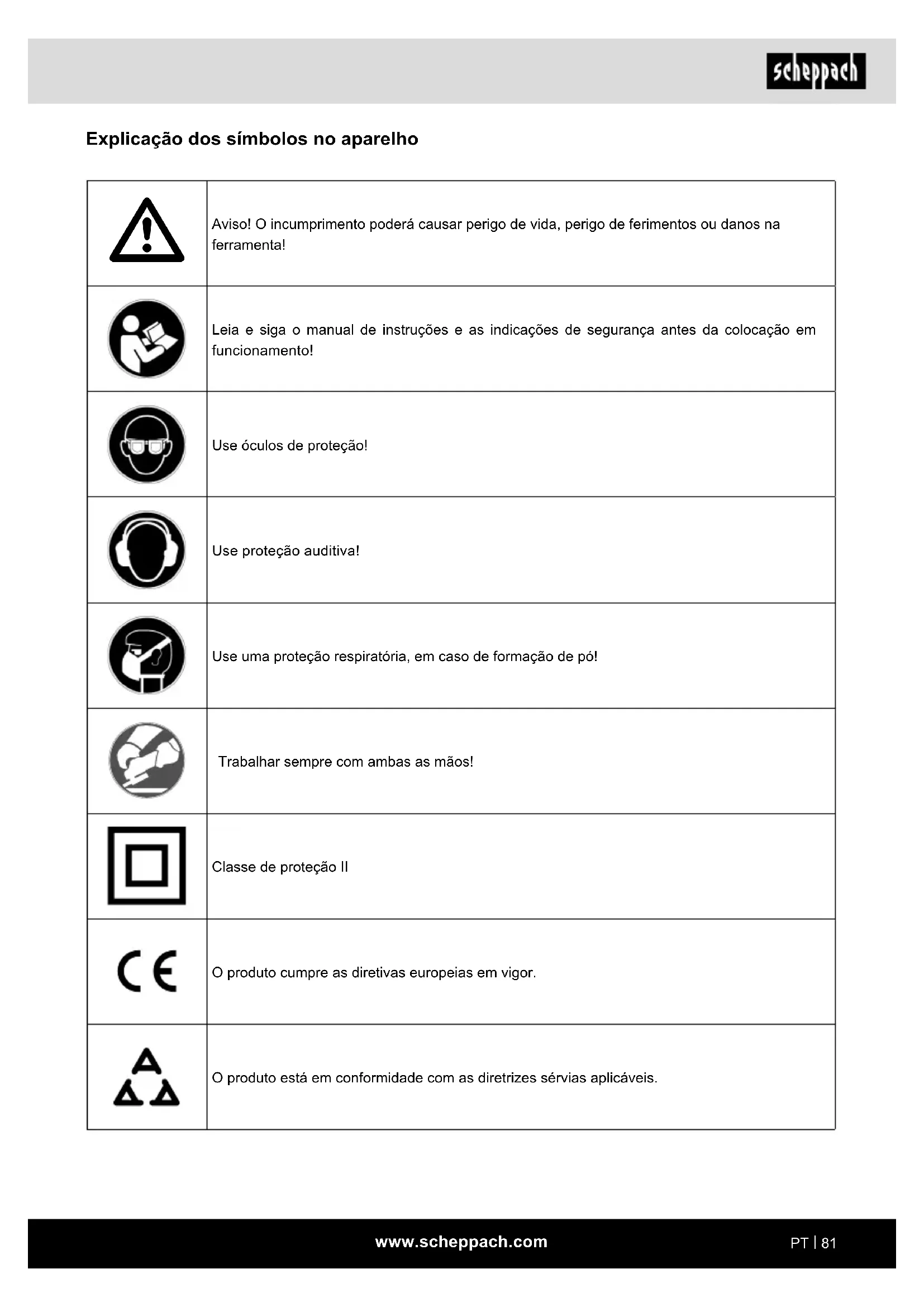 Aviso! O incumprimento poderá causar perigo de vida, perigo de ferimentos ou danos na ferramenta! Leia e siga o manual de instruções e as indicações de segurança antes da colocação em funcionamento! Use óculos de proteção! Use proteção auditiva! Use uma proteção respiratória, em caso de formação de pó! Trabalhar sempre com ambas as mãos! Classe de proteção II O produto cumpre as diretivas europeias em vigor. O produto está em conformidade com as diretrizes sérvias aplicáveis.www.scheppach.com