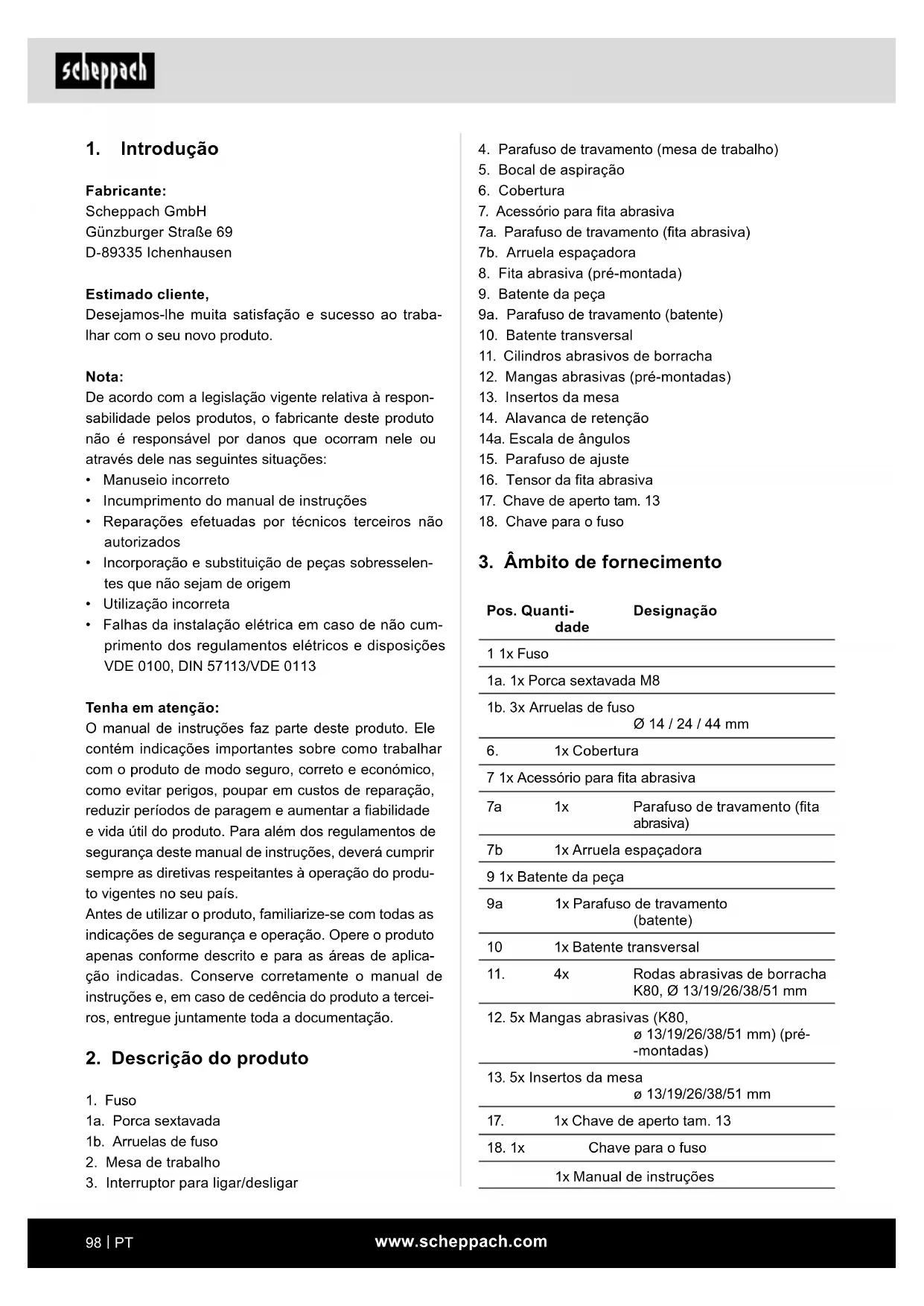 Fabricante: Scheppach GmbH Günzburger Straße 69 D-89335 Ichenhausen Estimado cliente, Desejamos-lhe muita satisfação e sucesso ao traba- lhar com o seu novo produto. Nota: De acordo com a legislação vigente relativa à respon- sabilidade pelos produtos, o fabricante deste produto não é responsável por danos que ocorram nele ou através dele nas seguintes situações: