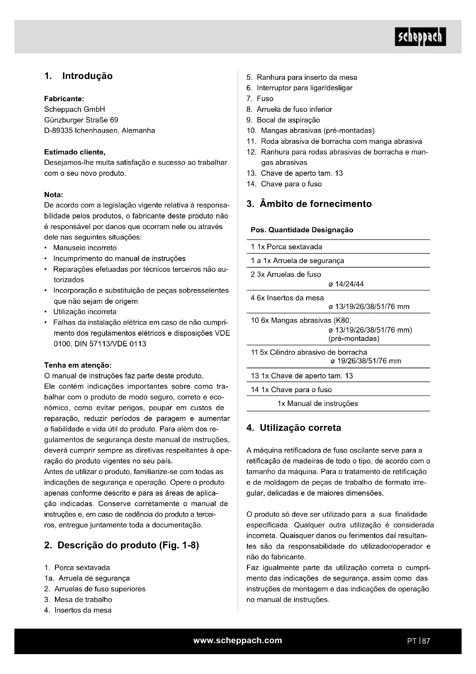 Fabricante: Scheppach GmbH Günzburger Straße 69 D-89335 Ichenhausen, Alemanha Estimado cliente, Desejamos-lhe muita satisfação e sucesso ao trabalhar com o seu novo produto. Nota: De acordo com a legislação vigente relativa à responsa- bilidade pelos produtos, o fabricante deste produto não é responsável por danos que ocorram nele ou através dele nas seguintes situações: