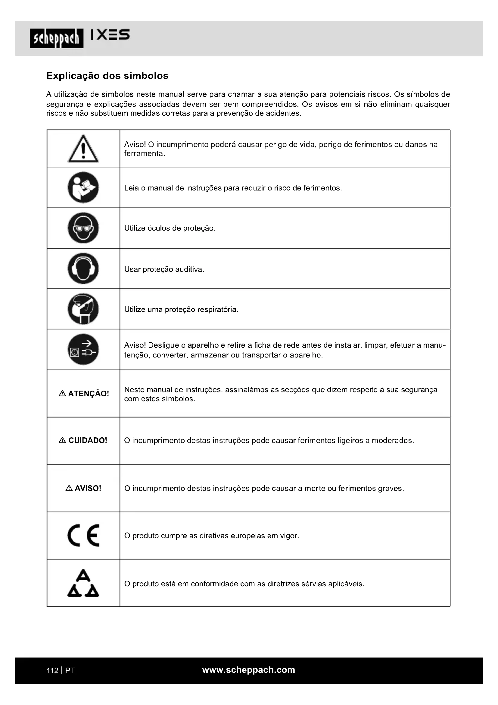 Explicação dos símbolos A utilização de símbolos neste manual serve para chamar a sua atenção para potenciais riscos. Os símbolos de segurança e explicações associadas devem ser bem compreendidos. Os avisos em si não eliminam quaisquer riscos e não substituem medidas corretas para a prevenção de acidentes. Aviso! O incumprimento poderá causar perigo de vida, perigo de ferimentos ou danos na ferramenta. Leia o manual de instruções para reduzir o risco de ferimentos. Utilize óculos de proteção. Usar proteção auditiva. Utilize uma proteção respiratória. Aviso! Desligue o aparelho e retire a cha de rede antes de instalar, limpar, efetuar a manu- tenção, converter, armazenar ou transportar o aparelho. m ATENÇÃO! Neste manual de instruções, assinalámos as secções que dizem respeito à sua segurança com estes símbolos. m CUIDADO! O incumprimento destas instruções pode causar ferimentos ligeiros a moderados. m AVISO! O incumprimento destas instruções pode causar a morte ou ferimentos graves. O produto cumpre as diretivas europeias em vigor. O produto está em conformidade com as diretrizes sérvias aplicáveis.www.scheppach.com