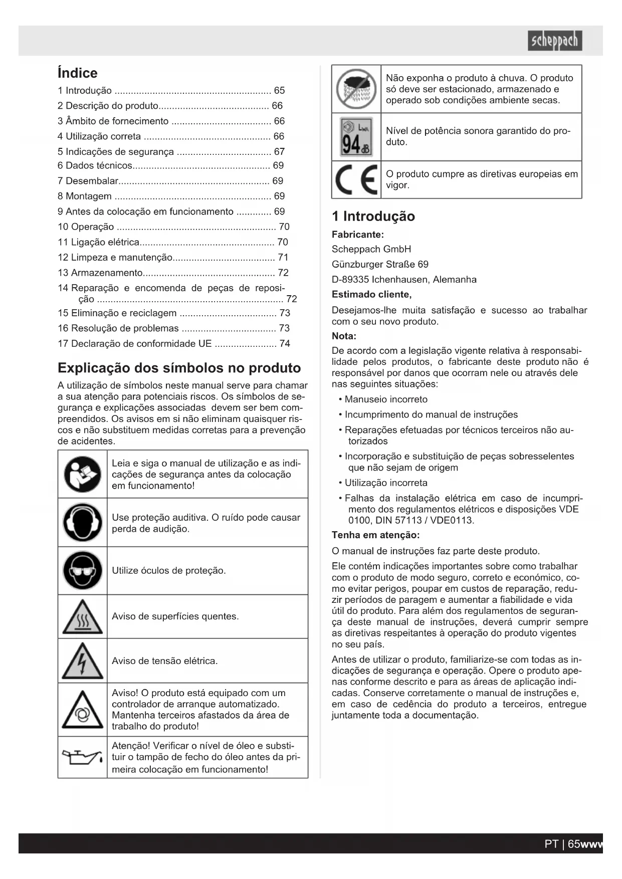 - 17 Declaração de conformidade UE Explicação dos símbolos no produto A utilização de símbolos neste manual serve para chamar a sua atenção para potenciais riscos. Os símbolos de se- gurança e explicações associadas devem ser bem com- preendidos. Os avisos em si não eliminam quaisquer ris- cos e não substituem medidas corretas para a prevenção de acidentes. Leia e siga o manual de utilização e as indi- cações de segurança antes da colocação em funcionamento! Use proteção auditiva. O ruído pode causar perda de audição. Utilize óculos de proteção. Aviso de superfícies quentes. Aviso de tensão elétrica. Aviso! O produto está equipado com um controlador de arranque automatizado. Mantenha terceiros afastados da área de trabalho do produto! Atenção! Verificar o nível de óleo e substi- tuir o tampão de fecho do óleo antes da pri- meira colocação em funcionamento! Não exponha o produto à chuva. O produto só deve ser estacionado, armazenado e operado sob condições ambiente secas. Nível de potência sonora garantido do pro- duto. O produto cumpre as diretivas europeias em vigor. 1 Introdução Fabricante: Scheppach GmbH Günzburger Straße 69 D-89335 Ichenhausen, Alemanha Estimado cliente, Desejamos-lhe muita satisfação e sucesso ao trabalhar com o seu novo produto. Nota: De acordo com a legislação vigente relativa à responsabi- lidade pelos produtos, o fabricante deste produto não é responsável por danos que ocorram nele ou através dele nas seguintes situações: p. 74