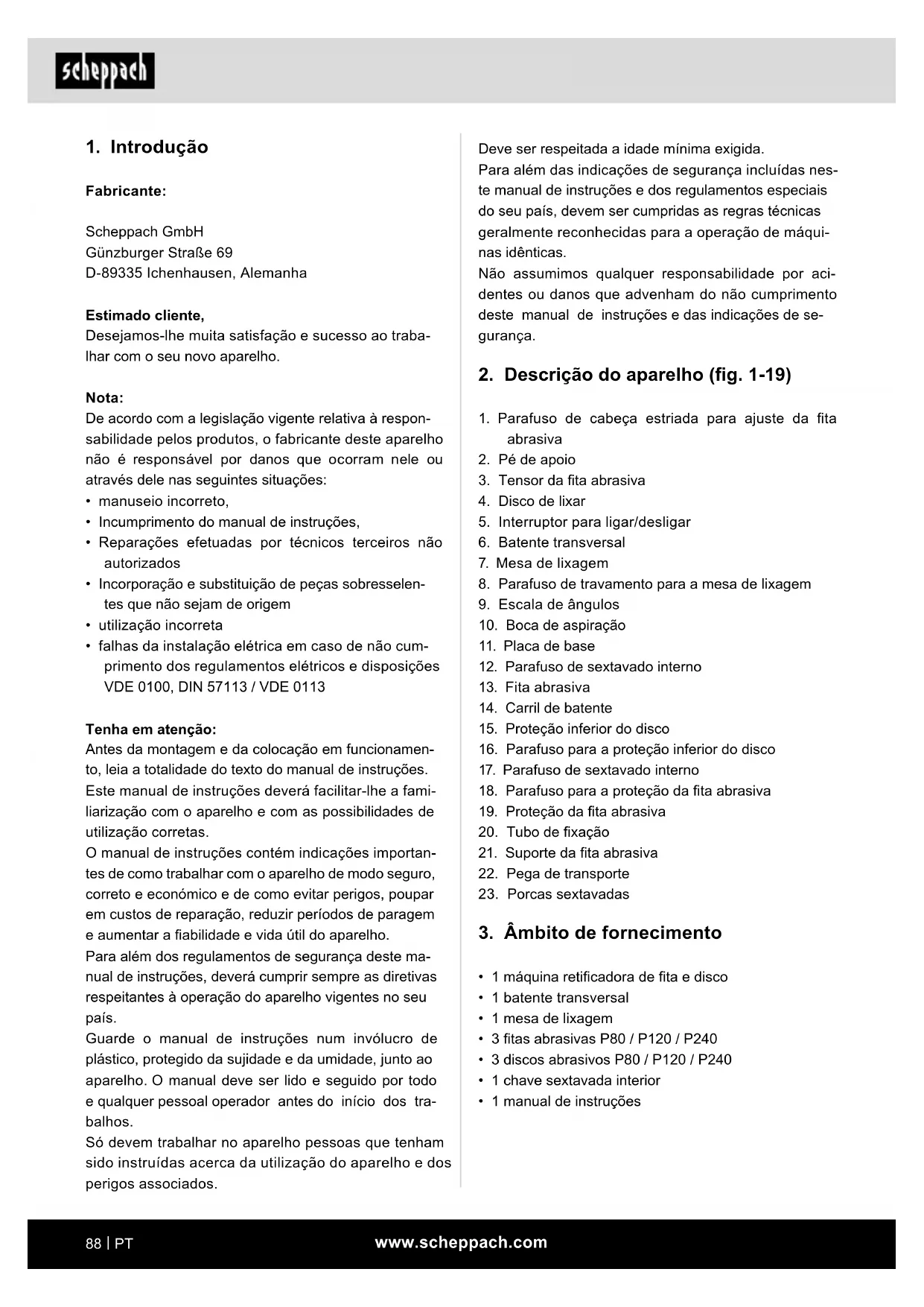 Tenha em atenção: Antes da montagem e da colocação em funcionamen- to, leia a totalidade do texto do manual de instruções. Este manual de instruções deverá facilitar-lhe a fami- liarização com o aparelho e com as possibilidades de utilização corretas. O manual de instruções contém indicações importan- tes de como trabalhar com o aparelho de modo seguro, correto e económico e de como evitar perigos, poupar em custos de reparação, reduzir períodos de paragem e aumentar a abilidade e vida útil do aparelho. Para além dos regulamentos de segurança deste ma- nual de instruções, deverá cumprir sempre as diretivas respeitantes à operação do aparelho vigentes no seu país. Guarde o manual de instruções num invólucro de plástico, protegido da sujidade e da umidade, junto ao aparelho. O manual deve ser lido e seguido por todo e qualquer pessoal operador antes do início dos tra- balhos. Só devem trabalhar no aparelho pessoas que tenham sido instruídas acerca da utilização do aparelho e dos perigos associados.www.scheppach.com