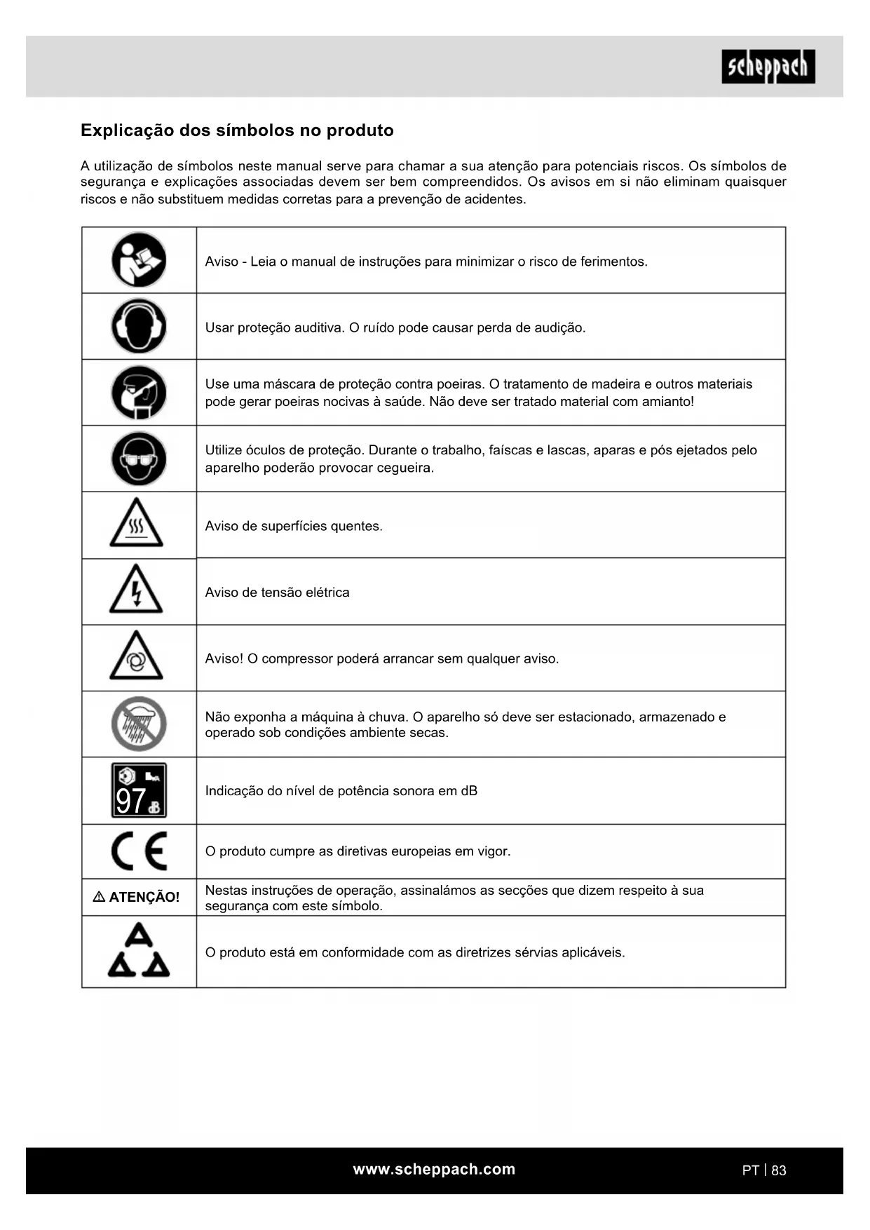 Indicação do nível de potência sonora em dB O produto cumpre as diretivas europeias em vigor. m ATENÇÃO! Nestas instruções de operação, assinalámos as secções que dizem respeito à sua segurança com este símbolo. O produto está em conformidade com as diretrizes sérvias aplicáveis.www.scheppach.com