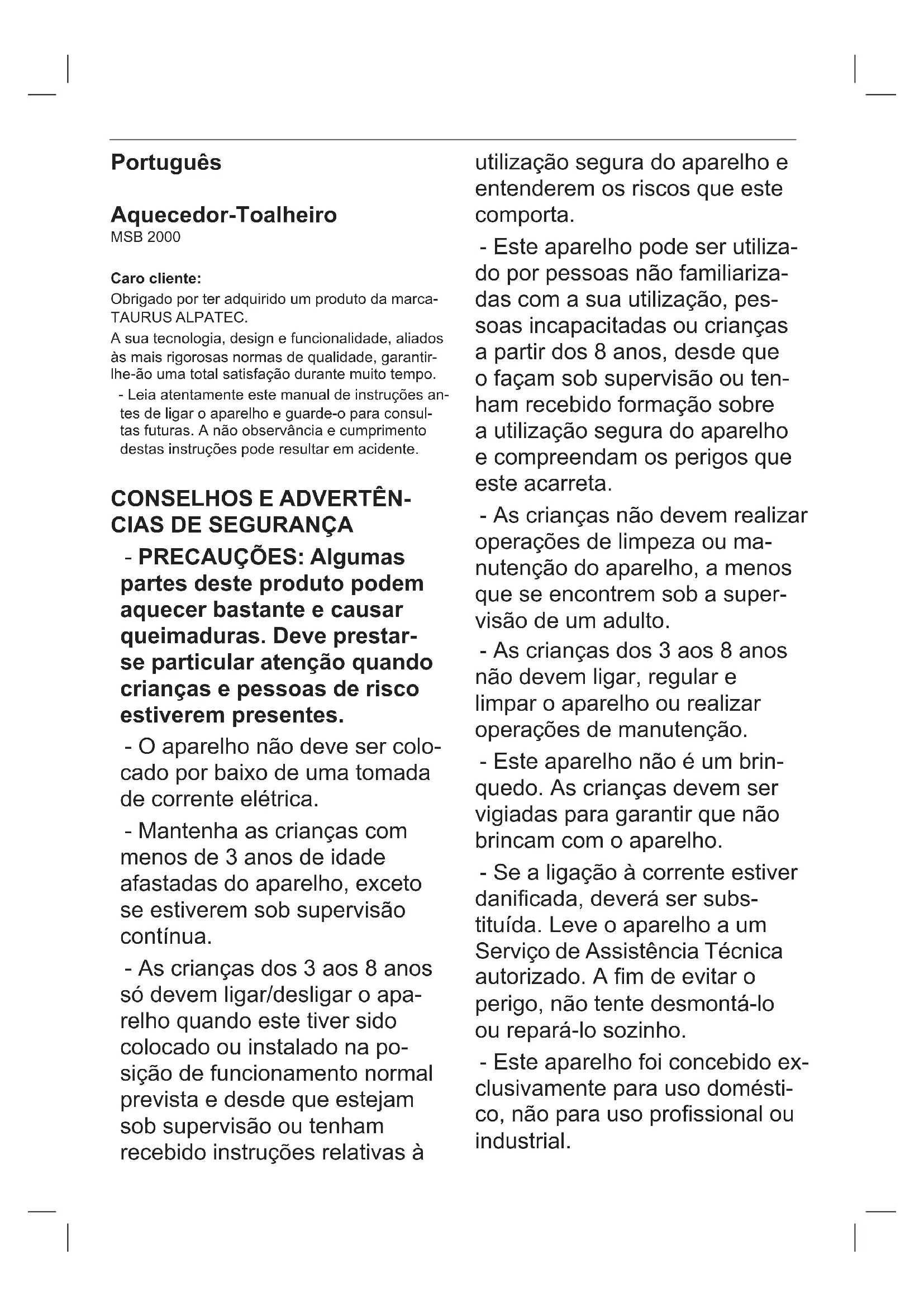 Alpatec MSB 2000 - Toalheiro elétrico TAURUS - Manual de utilização gratuito