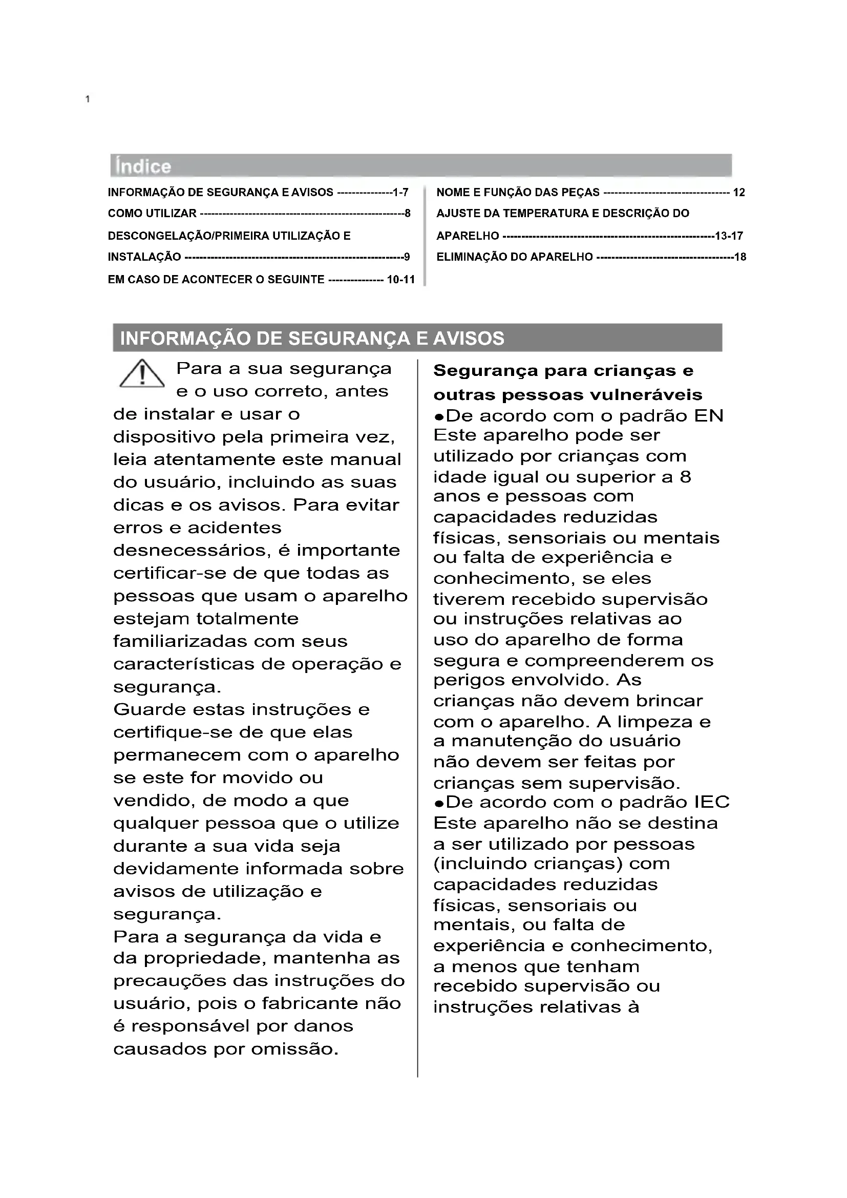 De acordo com o padrão IEC Este aparecido não se destina a ser utilizado por pessoas (incluindo crianças) com capacidades reduzidas físicas, sensoriais ou mentalais, ou falta de experiência e conheçimento, a menos que tenham recebido supervisão ou instruções relativas à
