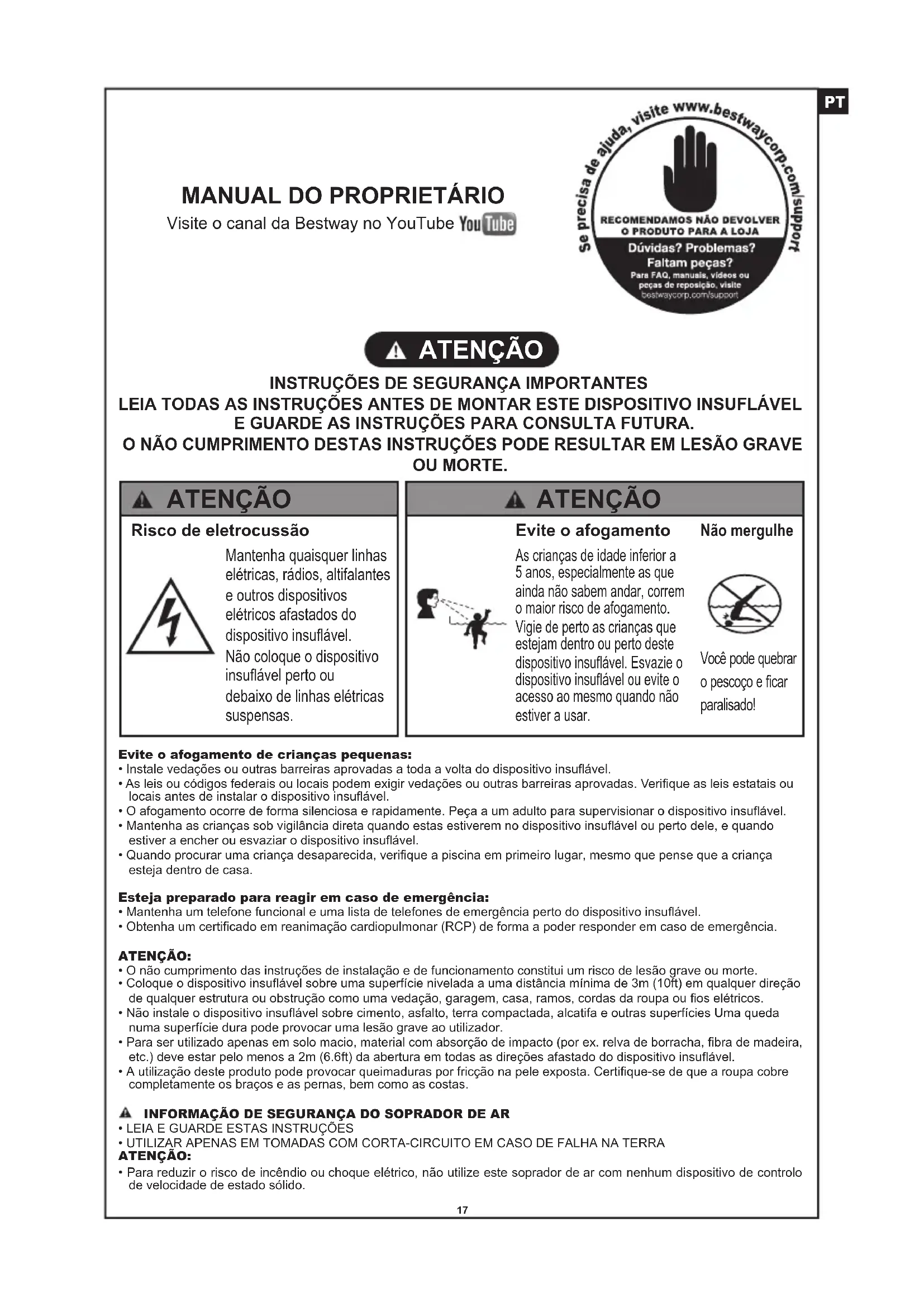 Visite o canal da Bestway no YouTube ATENÇÃO Risco de eletrocussão Mantenha quaisquer linhas elétricas, rádios, altifalantes e outros dispositivos elétricos afastados do dispositivo insuável. Não coloque o dispositivo insuável perto ou debaixo de linhas elétricas suspensas. ATENÇÃO Evite o afogamento As crianças de idade inferior a 5 anos, especialmente as que ainda não sabem andar, correm o maior risco de afogamento. Vigie de perto as crianças que estejam dentro ou perto deste dispositivo insuável. Esvazie o dispositivo insuável ou evite o acesso ao mesmo quando não estiver a usar. Não mergulhe Você pode quebrar o pescoço e car paralisado!303021296678_53384_14x21cm_