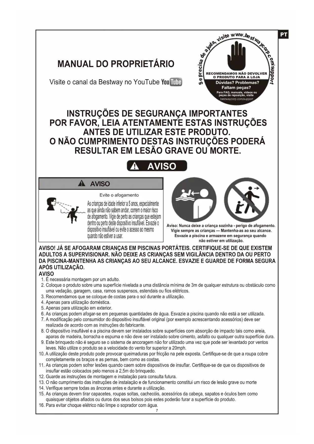 INSTRUÇÕES DE SEGURANÇA IMPORTANTESPOR FAVOR, LEIA ATENTAMENTE ESTAS INSTRUÇÕES ANTES DE UTILIZAR ESTE PRODUTO.O NÃO CUMPRIMENTO DESTAS INSTRUÇÕES PODERÁ RESULTAR EM LESÃO GRAVE OU MORTE.AVISOAviso: Nunca deixe a criança sozinha - perigo de afogamento.Vigie sempre as crianças — Mantenha-as ao seu alcance.Esvazie a piscina e armazene em segurança quando não estiver em utilização.Evite o afogamentoAVISO As crianças de idade inferior a 5 anos, especialmente as que ainda não sabem andar, correm o maior risco de afogamento. Vigie de perto as crianças que estejam dentro ou perto deste dispositivo insuflável. Esvazie o dispositivo insuflável ou evite o acesso ao mesmo quando não estiver a usar. AVISO! JÁ SE AFOGARAM CRIANÇAS EM PISCINAS PORTÁTEIS. CERTIFIQUE-SE DE QUE EXISTEM ADULTOS A SUPERVISIONAR. NÃO DEIXE AS CRIANÇAS SEM VIGILÂNCIA DENTRO DA OU PERTO DA PISCINA-MANTENHA AS CRIANÇAS AO SEU ALCANCE. ESVAZIE E GUARDE DE FORMA SEGURA APÓS UTILIZAÇÃO. AVISO