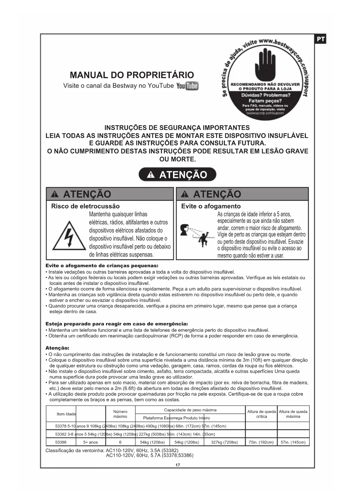 ATENÇÃO ATENÇÃO Risco de eletrocussão Mantenha quaisquer linhas elétricas, rádios, altifalantes e outros dispositivos elétricos afastados do dispositivo insuável. Não coloque o dispositivo insuável perto ou debaixo de linhas elétricas suspensas. ATENÇÃO Evite o afogamento As crianças de idade inferior a 5 anos, especialmente as que ainda não sabem andar, correm o maior risco de afogamento. Vigie de perto as crianças que estejam dentro ou perto deste dispositivo insuável. Esvazie o dispositivo insuável ou evite o acesso ao mesmo quando não estiver a usar. Evite o afogamento de crianças pequenas: