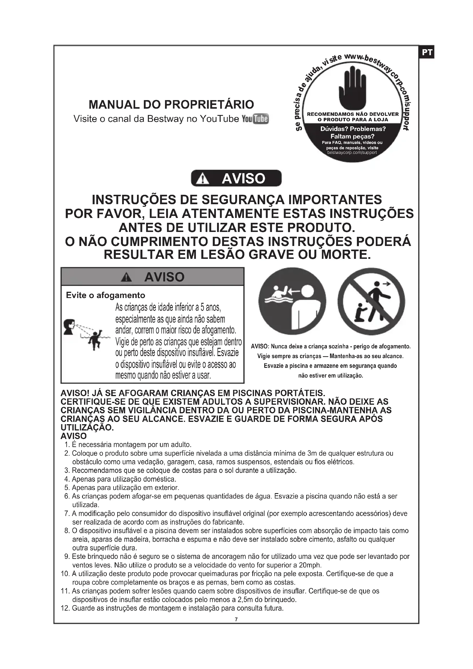 POR FAVOR, LEIA ATENTAMENTE ESTAS INSTRUÇÕES ANTES DE UTILIZAR ESTE PRODUTO. O NÃO CUMPRIMENTO DESTAS INSTRUÇÕES PODERÁ RESULTAR EM LESÃO GRAVE OU MORTE. AVISO 7AVISO! JÁ SE AFOGARAM CRIANÇAS EM PISCINAS PORTÁTEIS. CERTIFIQUE-SE DE QUE EXISTEM ADULTOS A SUPERVISIONAR. NÃO DEIXE AS CRIANÇAS SEM VIGILÂNCIA DENTRO DA OU PERTO DA PISCINA-MANTENHA AS CRIANÇAS AO SEU ALCANCE. ESVAZIE E GUARDE DE FORMA SEGURA APÓS UTILIZAÇÃO. AVISO