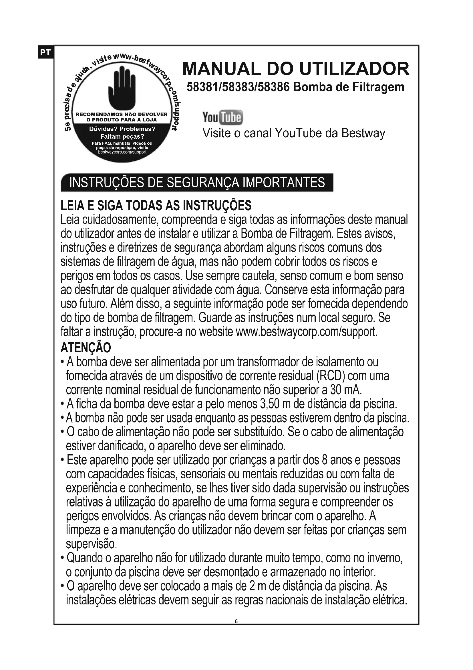 tLEIA E SIGA TODAS AS INSTRUÇÕES Leia cuidadosamente, compreenda e siga todas as informações deste manual do utilizador antes de instalar e utilizar a Bomba de Filtragem. Estes avisos, instruções e diretrizes de segurança abordam alguns riscos comuns dos sistemas de filtragem de água, mas não podem cobrir todos os riscos e perigos em todos os casos. Use sempre cautela, senso comum e bom senso ao desfrutar de qualquer atividade com água. Conserve esta informação para uso futuro. Além disso, a seguinte informação pode ser fornecida dependendo do tipo de bomba de filtragem. Guarde as instruções num local seguro. Se faltar a instrução, procure-a no website www.bestwaycorp.com/support. ATENÇÃO