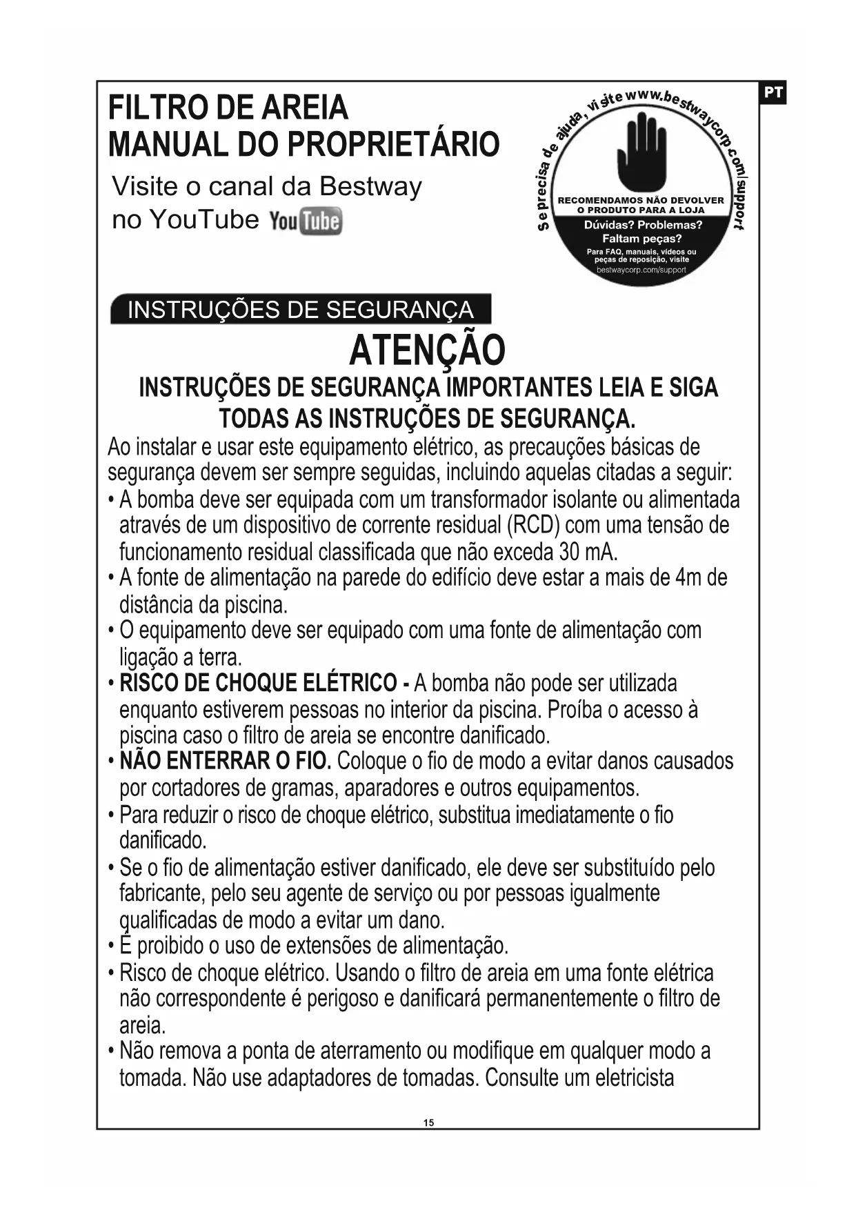 Visite o canal da Bestway no YouTube RECOMENDAMOS NÃO DEVOLVERO PRODUTO PARA A LOJA Dúvidas? Problemas?Faltam peças?Para FAQ, manuais, vídeos oupeças de reposição, visite bestwaycorp.com/support