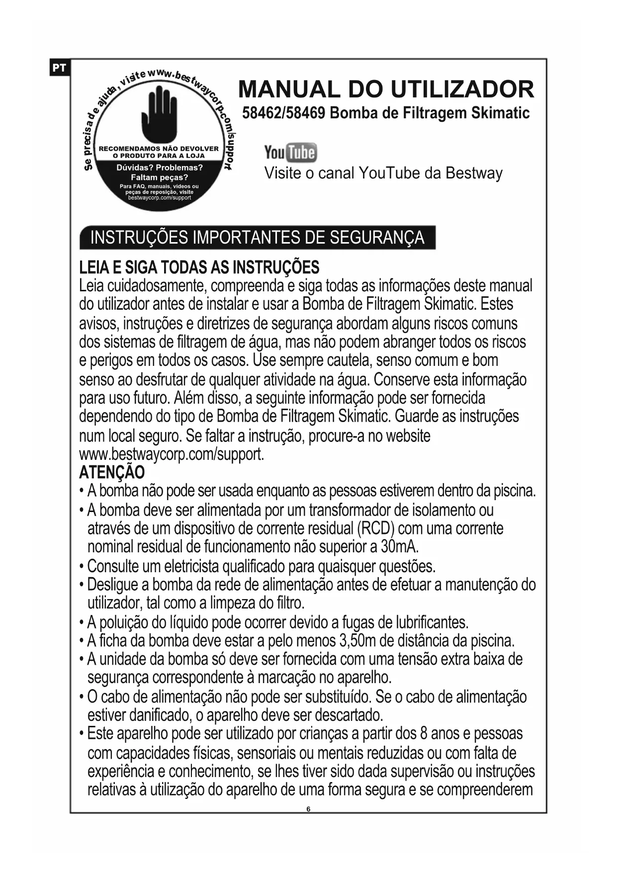 tDESCARTE LEIA E SIGA TODAS AS INSTRUÇÕES Leia cuidadosamente, compreenda e siga todas as informações deste manual do utilizador antes de instalar e usar a Bomba de Filtragem Skimatic. Estes avisos, instruções e diretrizes de segurança abordam alguns riscos comuns dos sistemas de filtragem de água, mas não podem abranger todos os riscos e perigos em todos os casos. Use sempre cautela, senso comum e bom senso ao desfrutar de qualquer atividade na água. Conserve esta informação para uso futuro. Além disso, a seguinte informação pode ser fornecida dependendo do tipo de Bomba de Filtragem Skimatic. Guarde as instruções num local seguro. Se faltar a instrução, procure-a no website www.bestwaycorp.com/support. ATENÇÃO