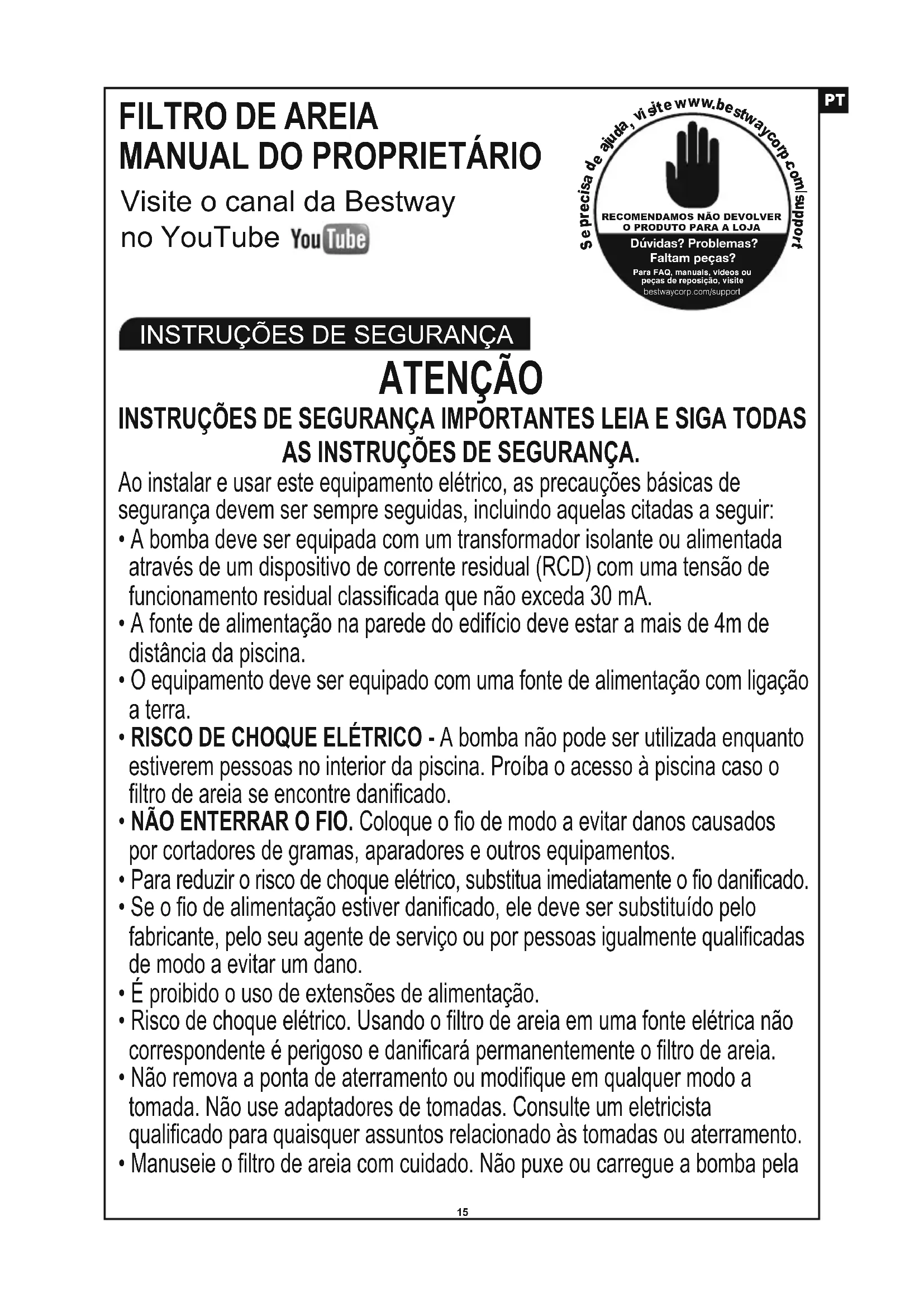Visite o canal da Bestway no YouTube RECOMENDAMOS NÃO DEVOLVERO PRODUTO PARA A LOJA Dúvidas? Problemas?Faltam peças?Para FAQ, manuais, vídeos oupeças de reposição, visite bestwaycorp.com/support