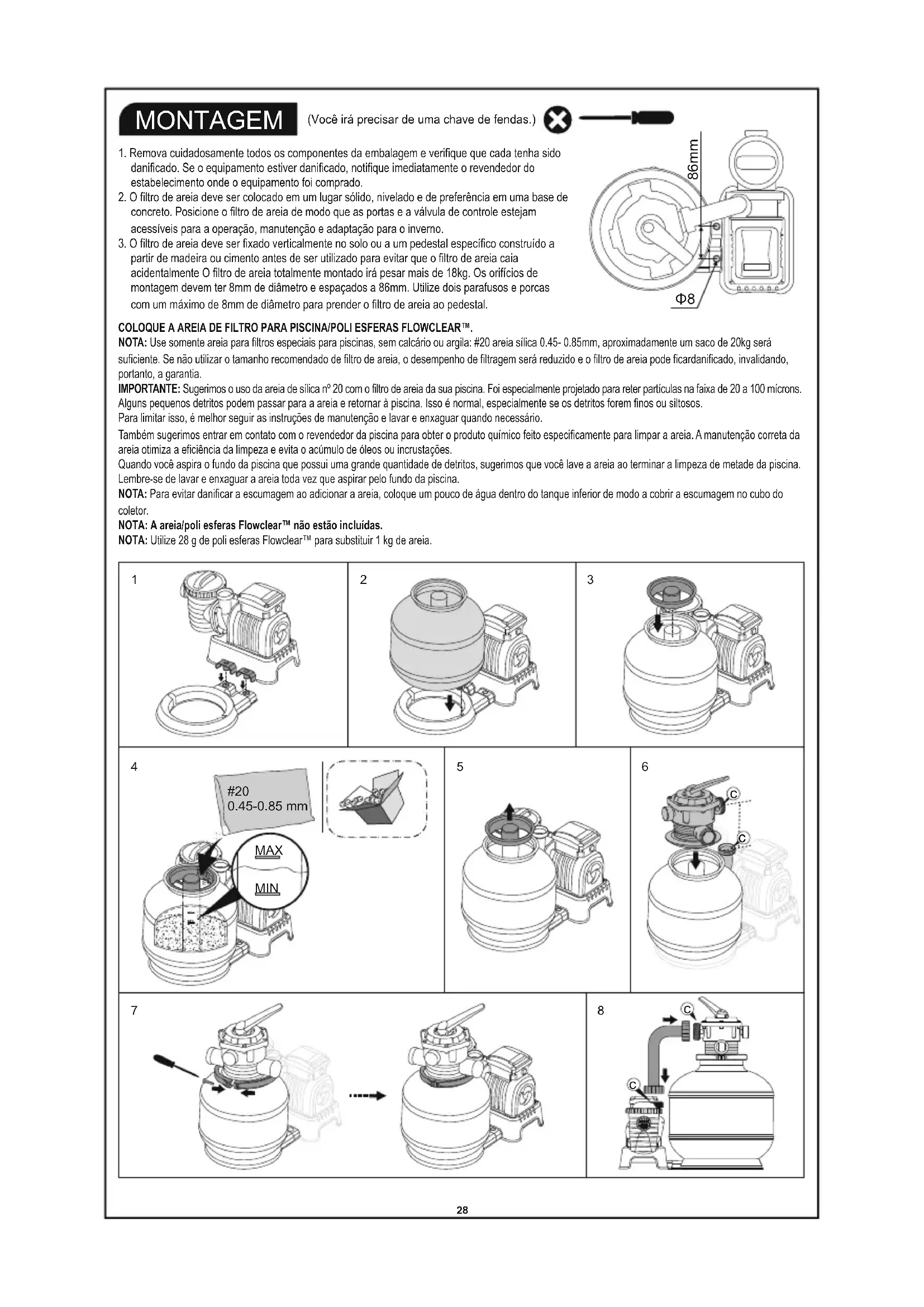 27COLOQUE A AREIA DE FILTRO PARA PISCINA/POLI ESFERAS FLOWCLEAR™. NOTA: Use somente areia para filtros especiais para piscinas, sem calcário ou argila: #20 areia sílica 0.45- 0.85mm, aproximadamente um saco de 20kg será suficiente. Se não utilizar o tamanho recomendado de filtro de areia, o desempenho de filtragem será reduzido e o filtro de areia pode ficardanificado, invalidando, portanto, a garantia. IMPORTANTE: Sugerimos o uso da areia de sílica nº 20 com o filtro de areia da sua piscina. Foi especialmente projetado para reter partículas na faixa de 20 a 100 mícrons. Alguns pequenos detritos podem passar para a areia e retornar à piscina. Isso é normal, especialmente se os detritos forem finos ou siltosos. Para limitar isso, é melhor seguir as instruções de manutenção e lavar e enxaguar quando necessário. Também sugerimos entrar em contato com o revendedor da piscina para obter o produto químico feito especificamente para limpar a areia. A manutenção correta da areia otimiza a eficiência da limpeza e evita o acúmulo de óleos ou incrustações. Quando você aspira o fundo da piscina que possui uma grande quantidade de detritos, sugerimos que você lave a areia ao terminar a limpeza de metade da piscina. Lembre-se de lavar e enxaguar a areia toda vez que aspirar pelo fundo da piscina. NOTA: Para evitar danificar a escumagem ao adicionar a areia, coloque um pouco de água dentro do tanque inferior de modo a cobrir a escumagem no cubo do coletor.NOTA: A areia/poli esferas Flowclear™ não estão incluídas.NOTA: Utilize 28 g de poli esferas Flowclear™ para substituir 1 kg de areia.(Você irá precisar de uma chave de fendas.) MONTAGEM 1. Remova cuidadosamente todos os componentes da embalagem e verifique que cada tenha sido danificado. Se o equipamento estiver danificado, notifique imediatamente o revendedor do estabelecimento onde o equipamento foi comprado.2. O filtro de areia deve ser colocado em um lugar sólido, nivelado e de preferência em uma base de concreto. Posicione o filtro de areia de modo que as portas e a válvula de controle estejam acessíveis para a operação, manutenção e adaptação para o inverno.3. O filtro de areia deve ser fixado verticalmente no solo ou a um pedestal específico construído a partir de madeira ou cimento antes de ser utilizado para evitar que o filtro de areia caia acidentalmente O filtro de areia totalmente montado irá pesar mais de 18kg. Os orifícios de montagem devem ter 8mm de diâmetro e espaçados a 86mm. Utilize dois parafusos e porcas com um máximo de 8mm de diâmetro para prender o filtro de areia ao pedestal.