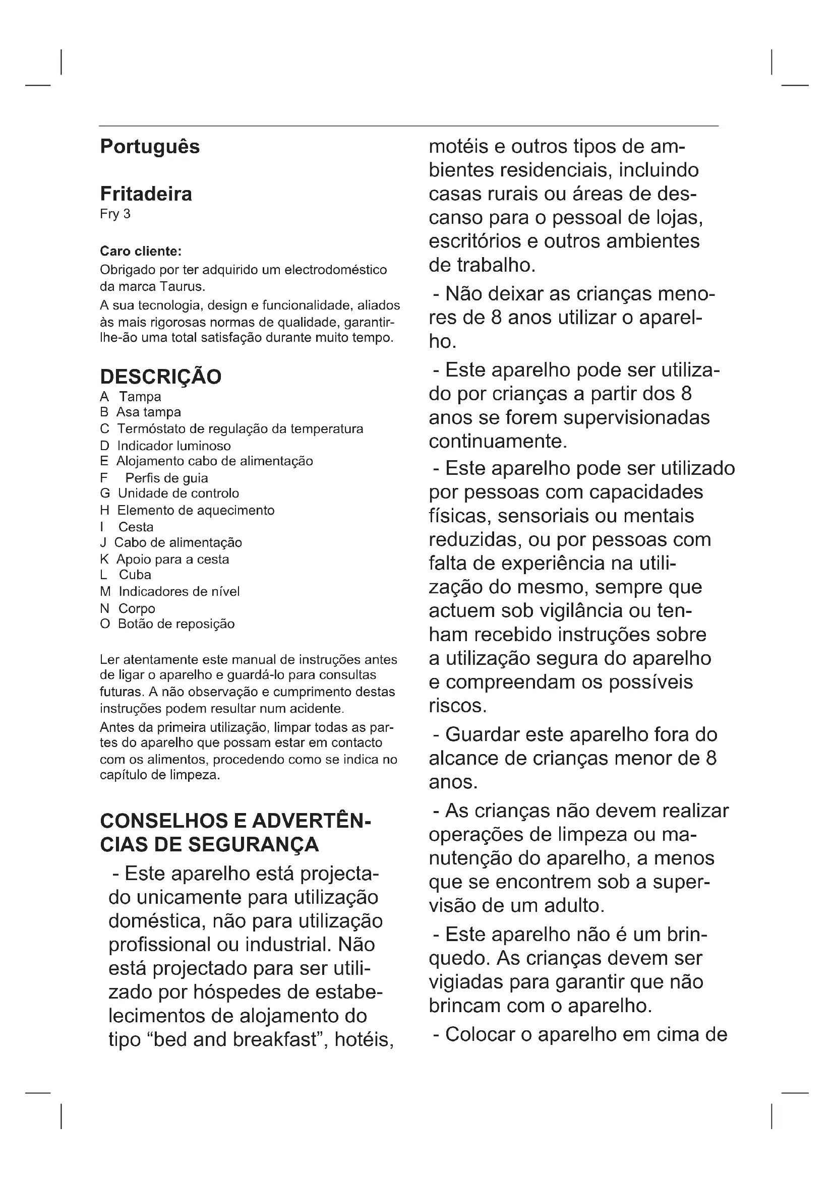- I materiali che costituiscono l’imballaggio di questo apparecchio sono riciclabili. Per lo smaltimento, utilizzare gli appositi contenitori pubblici, adatti per ogni tipo di materiale. - Il prodotto non contiene sostanze dannose per l’ambiente. Questo simbolo indica che, per smaltire il prodotto al termine della sua durata utile, occorre depositarlo presso un ente di smaltimento autorizzato alla raccolta differenziatadiriutidiapparecchiature elettriche ed elettroniche (RAEE).Questo apparecchio soddisfa la Direttiva 2006/95/ EC di Bassa Tensione, la Direttiva 2004/108/ EC di Compatibilità Elettromagnetica, la Direttiva 2011/65/EC sui limiti all’impiego di determinate sostanze pericolose negli apparecchi elettrici ed elettronici e la Direttiva 2009/125/EC di Ecode- sign dei prodotti che consumano energia.Português Fritadeira Fry 3 Caro cliente: Obrigado por ter adquirido um electrodoméstico da marca Taurus. A sua tecnologia, design e funcionalidade, aliados às mais rigorosas normas de qualidade, garantir- lhe-ão uma total satisfação durante muito tempo. DESCRIÇÃO A Tampa B Asa tampa C Termóstato de regulação da temperatura D Indicador luminoso E Alojamento cabo de alimentação F Persdeguia G Unidade de controlo H Elemento de aquecimento I Cesta J Cabo de alimentação K Apoio para a cesta L Cuba M Indicadores de nível N Corpo O Botão de reposição Ler atentamente este manual de instruções antes de ligar o aparelho e guardá-lo para consultas futuras. A não observação e cumprimento destas instruções podem resultar num acidente. Antes da primeira utilização, limpar todas as par- tes do aparelho que possam estar em contacto com os alimentos, procedendo como se indica no capítulo de limpeza.