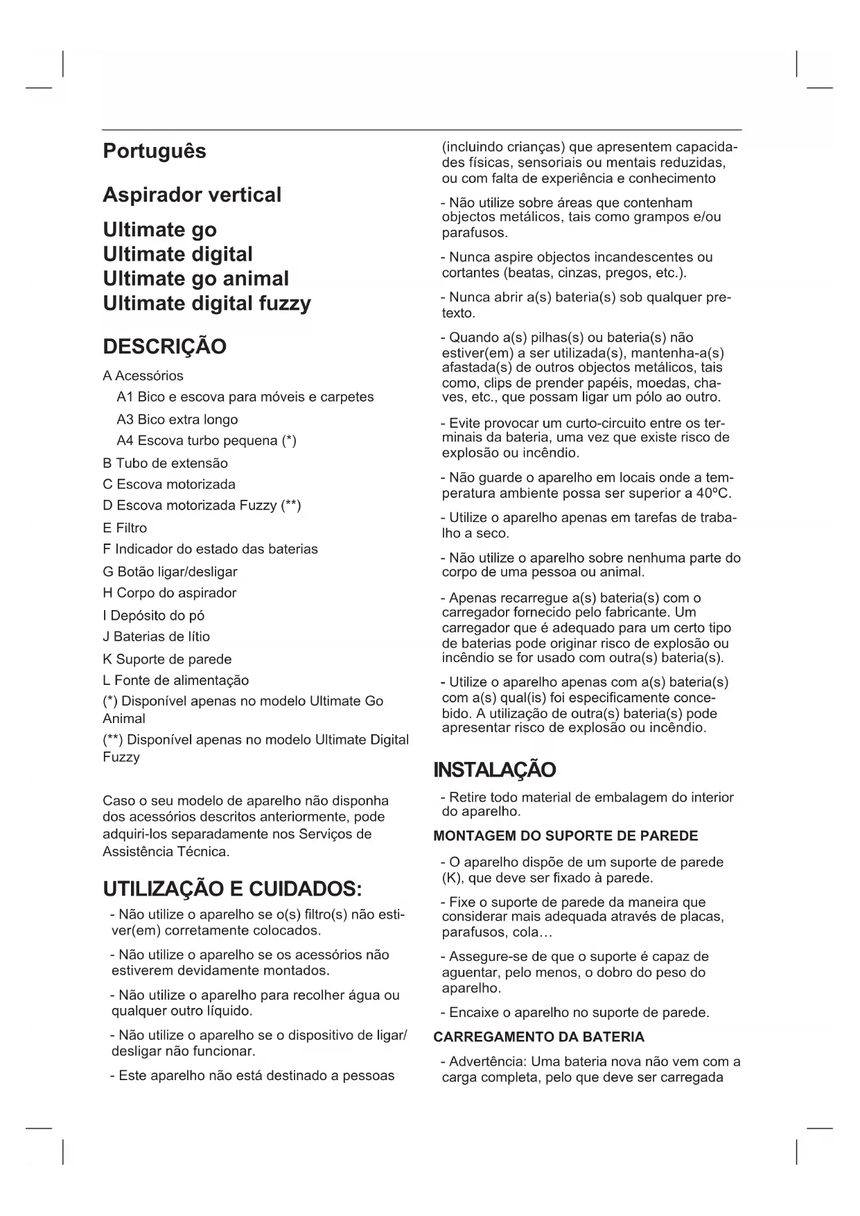 TERMINE DELLA SUA DURATA UTILE, PROCEDERE A: - Aprire il corpo superiore dell’apparecchio, avendo rimosso precedentemente le viti di ssaggio con l’aiuto di un cacciavite(Fig.7). - Estrarre con sicurezza la batteria dal suo alloggio.Português Aspirador vertical Ultimate go Ultimate digital Ultimate go animal Ultimate digital fuzzy DESCRIÇÃO A Acessórios A1 Bico e escova para móveis e carpetes A3 Bico extra longo A4 Escova turbo pequena (*) B Tubo de extensão C Escova motorizada D Escova motorizada Fuzzy (**) E Filtro F Indicador do estado das baterias G Botão ligar/desligar H Corpo do aspirador I Depósito do pó J Baterias de lítio K Suporte de parede L Fonte de alimentação (*) Disponível apenas no modelo Ultimate Go Animal (**) Disponível apenas no modelo Ultimate Digital Fuzzy Caso o seu modelo de aparelho não disponha dos acessórios descritos anteriormente, pode adquiri-los separadamente nos Serviços de Assistência Técnica. UTILIZAÇÃO E CUIDADOS: - Não utilize o aparelho se o(s) ltro(s) não esti- ver(em) corretamente colocados. - Não utilize o aparelho se os acessórios não estiverem devidamente montados. - Não utilize o aparelho para recolher água ou qualquer outro líquido. - Não utilize o aparelho se o dispositivo de ligar/ desligar não funcionar. - Este aparelho não está destinado a pessoas (incluindo crianças) que apresentem capacida- des físicas, sensoriais ou mentais reduzidas, ou com falta de experiência e conhecimento - Não utilize sobre áreas que contenham objectos metálicos, tais como grampos e/ou parafusos. - Nunca aspire objectos incandescentes ou cortantes (beatas, cinzas, pregos, etc.). - Nunca abrir a(s) bateria(s) sob qualquer pre- texto. - Quando a(s) pilhas(s) ou bateria(s) não estiver(em) a ser utilizada(s), mantenha-a(s) afastada(s) de outros objectos metálicos, tais como, clips de prender papéis, moedas, cha- ves, etc., que possam ligar um pólo ao outro. - Evite provocar um curto-circuito entre os ter- minais da bateria, uma vez que existe risco de explosão ou incêndio. - Não guarde o aparelho em locais onde a tem- peratura ambiente possa ser superior a 40ºC. - Utilize o aparelho apenas em tarefas de traba- lho a seco. - Não utilize o aparelho sobre nenhuma parte do corpo de uma pessoa ou animal. - Apenas recarregue a(s) bateria(s) com o carregador fornecido pelo fabricante. Um carregador que é adequado para um certo tipo de baterias pode originar risco de explosão ou incêndio se for usado com outra(s) bateria(s). - Utilize o aparelho apenas com a(s) bateria(s) com a(s) qual(is) foi especicamente conce- bido. A utilização de outra(s) bateria(s) pode apresentar risco de explosão ou incêndio. INSTALAÇÃO - Retire todo material de embalagem do interior do aparelho.