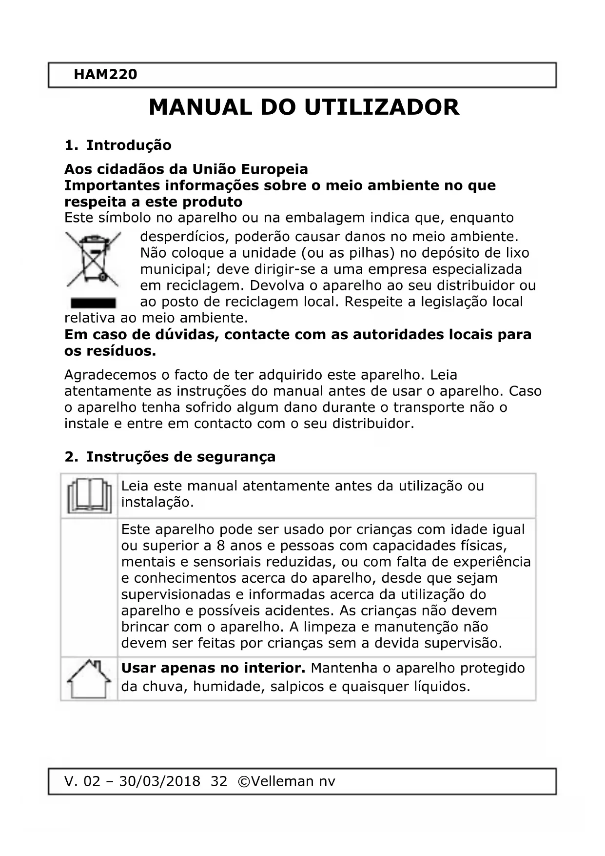 Usar apenas no interior. Mantenha o aparelho protegido da chuva, humidade, salpicos e quaisquer líquidos.HAM220