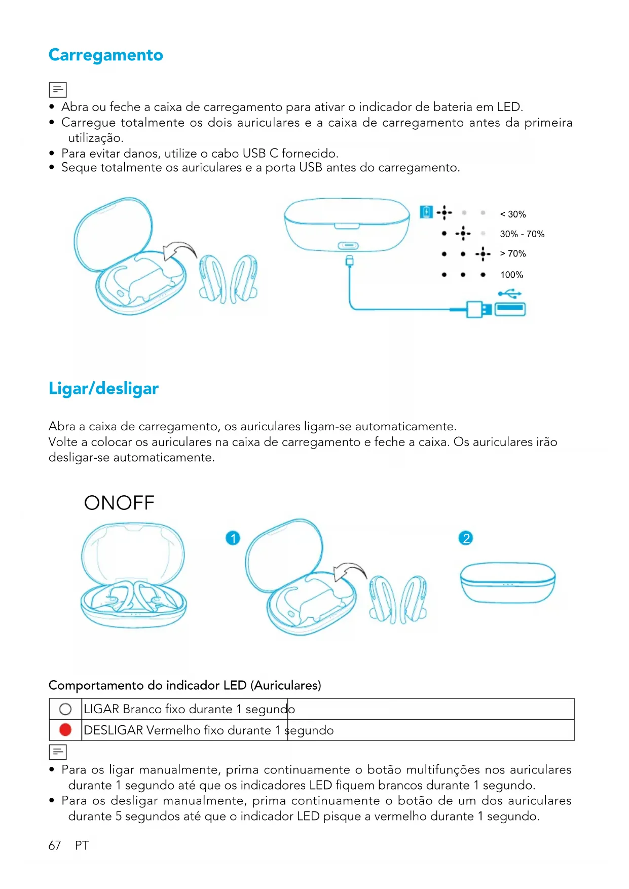 - Seque totalmente os auriculares e a porta USB antes do carregamento. < 30% 30% - 70% > 70% 100% Ligar/desligar Abra a caixa de carregamento, os auriculares ligam-se automaticamente. Volte a colocar os auriculares na caixa de carregamento e feche a caixa. Os auriculares irão desligar-se automaticamente. ON OFF