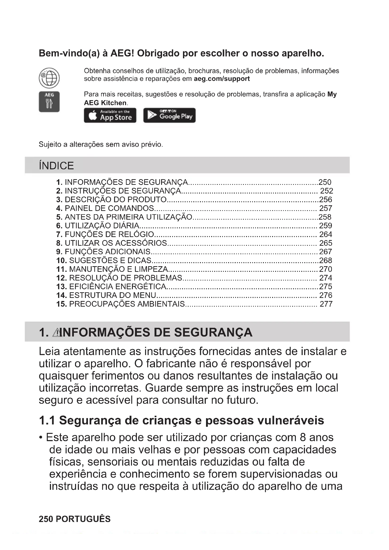 - Este aparelho pode ser utilizado por crianças com 8 anos de idade ou mais velhas e por pessoas com capacidades físicas, sensoriais ou mentais reduzidas ou falta de experiência e conhecimento se forem supervisionadas ou instruídas no que respeita à utilização do aparelho de uma 250 PORTUGUÊSforma segura e compreenderem os perigos envolvidos. É necessário manter as crianças com menos de 8 anos de idade e pessoas com incapacidades muito extensas e complexas afastadas do aparelho, a menos que sejam constantemente vigiadas.