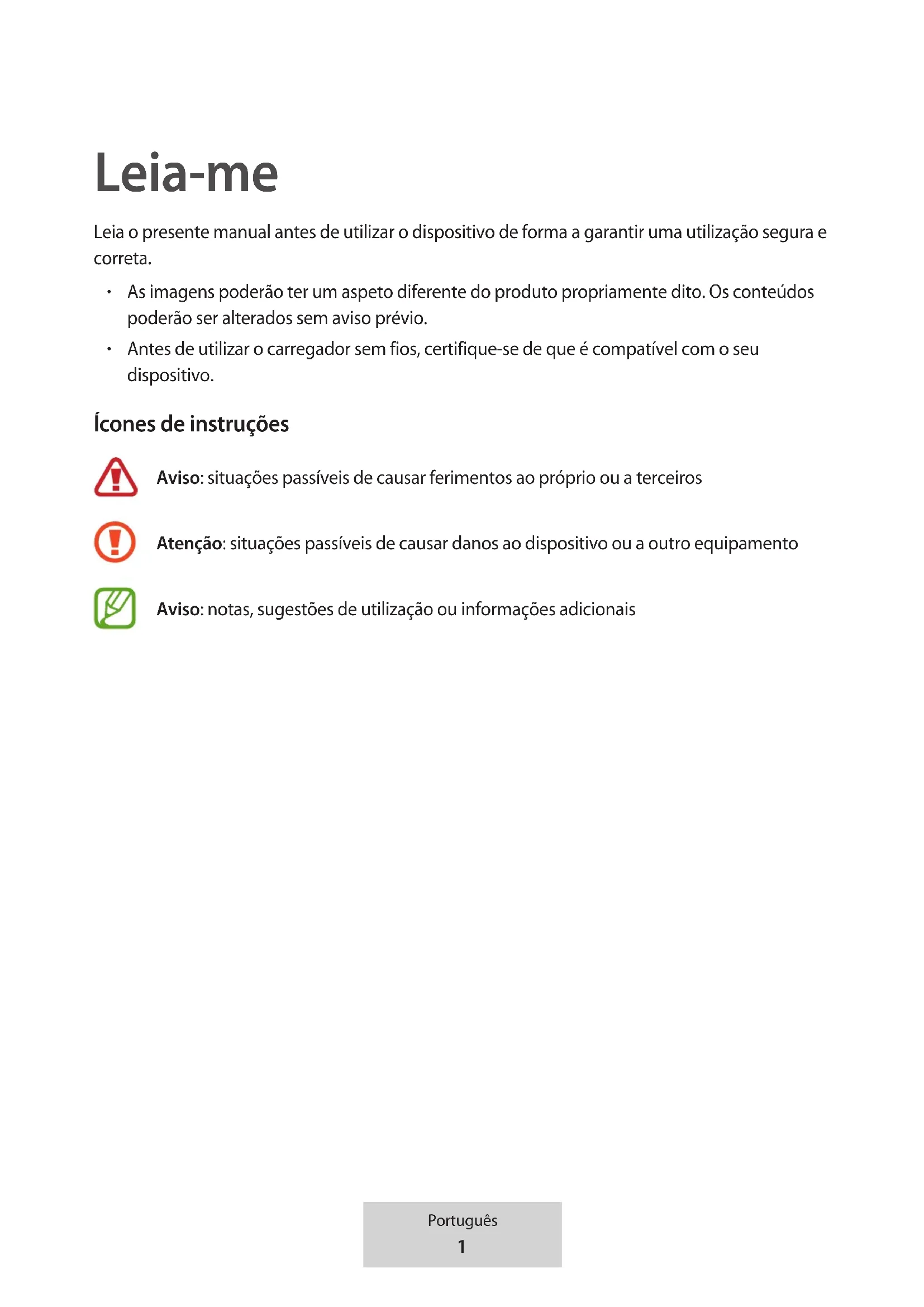 Antes de usar o carregador sem fio, verifique se ele é compatível com seu aparelho. Ícones de instrução Aviso: situações que podem causar ferimentos a você ou terceiros Cuidado: situações que podem causar danos ao seu acessório ou a outros equipamentos Aviso: notas, dicas de uso ou informações adicionais2 Português (Brasil) Informações básicas Conteúdo da embalagem Verifique na caixa do produto os seguintes itens:
