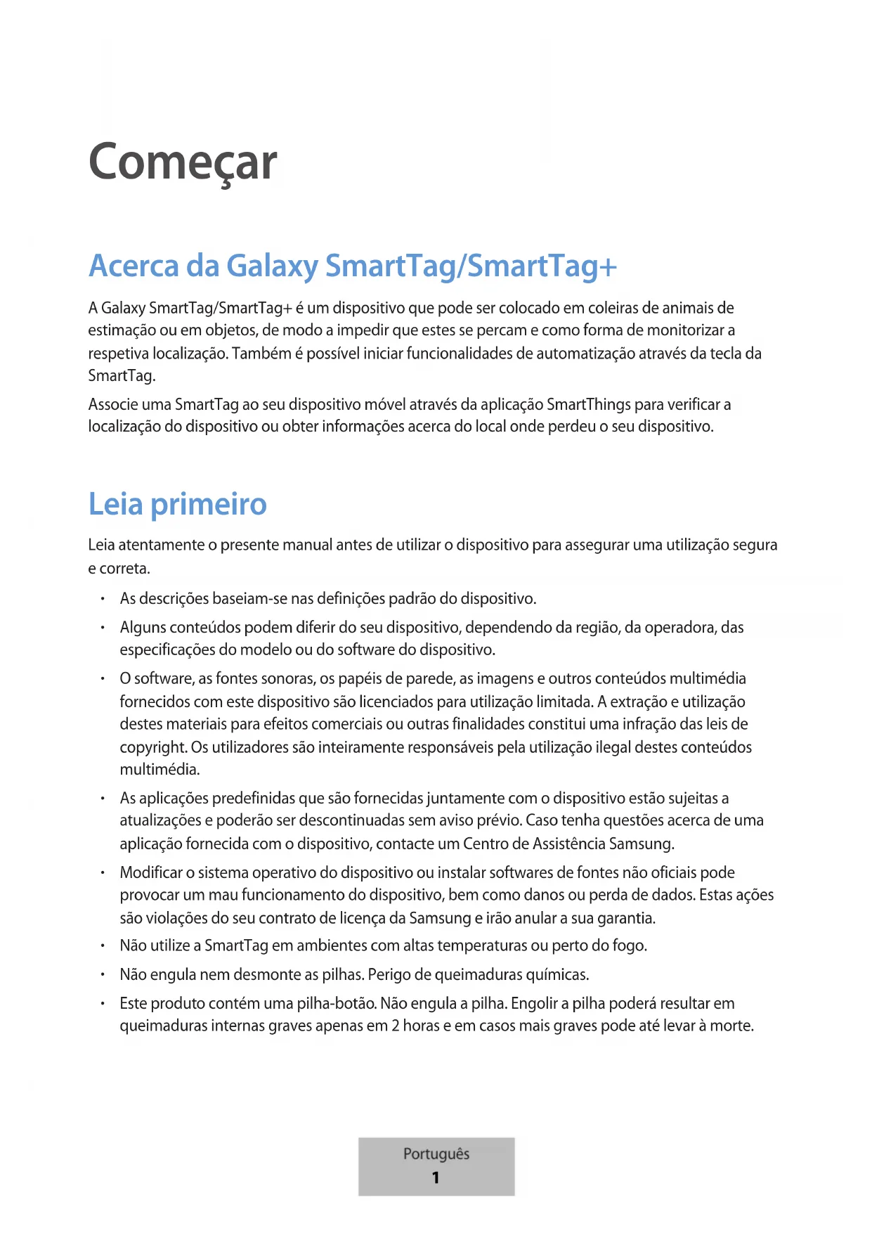 Começar Acerca da Galaxy SmartTag/SmartTag+ A Galaxy SmartTag/SmartTag+ é um dispositivo que pode ser colocado em coleiras de animais de estimação ou em objetos, de modo a impedir que estes se percam e como forma de monitorizar a respetiva localização. Também é possível iniciar funcionalidades de automatização através da tecla da SmartTag. Associe uma SmartTag ao seu dispositivo móvel através da aplicação SmartThings para verificar a localização do dispositivo ou obter informações acerca do local onde perdeu o seu dispositivo. Leia primeiro Leia atentamente o presente manual antes de utilizar o dispositivo para assegurar uma utilização segura e correta.