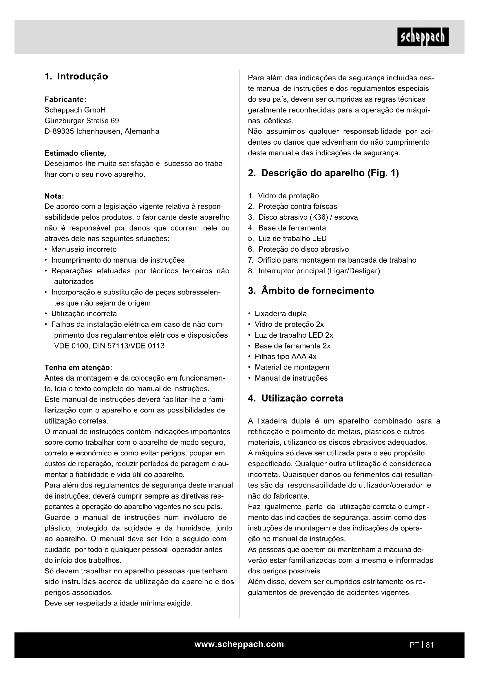 Fabricante: Scheppach GmbH Günzburger Straße 69 D-89335 Ichenhausen, Alemanha Estimado cliente, Desejamos-lhe muita satisfação e sucesso ao traba- lhar com o seu novo aparelho. Nota: De acordo com a legislação vigente relativa à respon- sabilidade pelos produtos, o fabricante deste aparelho não é responsável por danos que ocorram nele ou através dele nas seguintes situações: