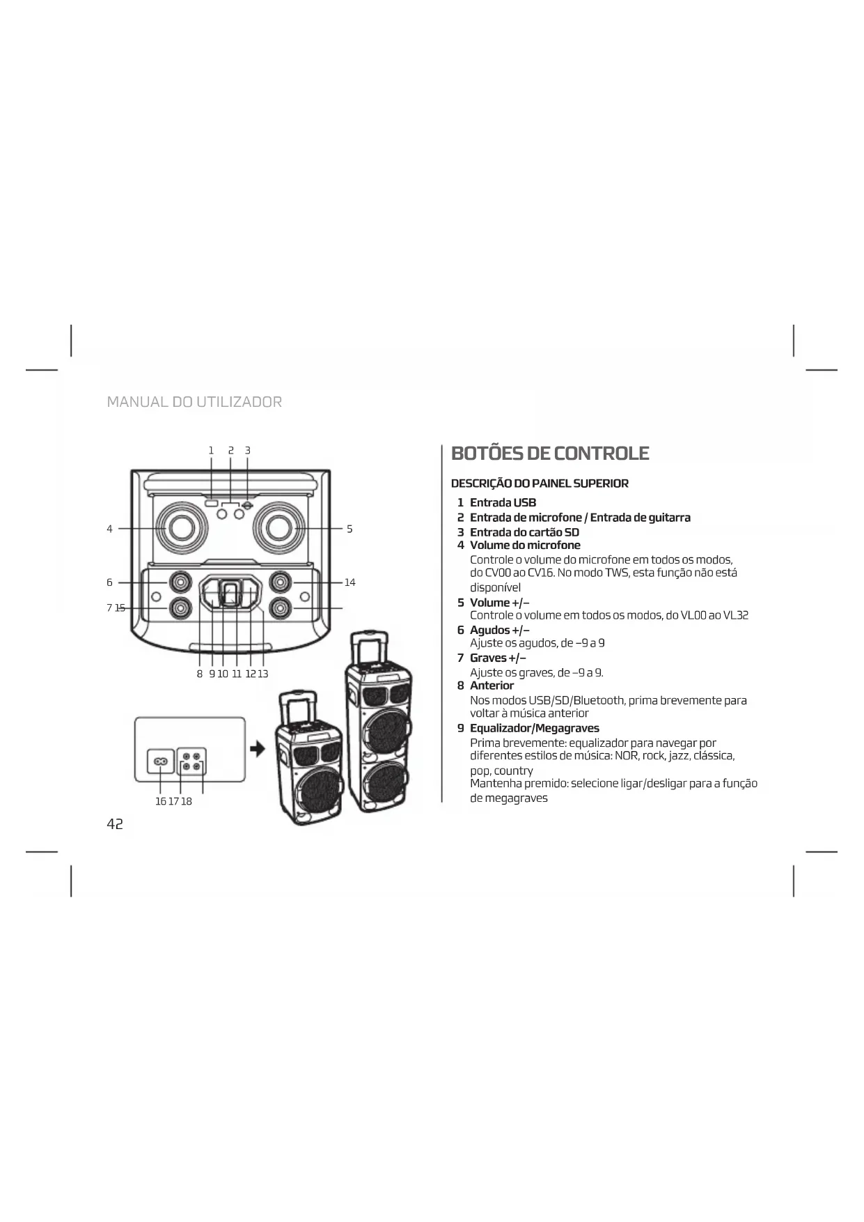 Entrada USB Entrada de microfone / Entrada de guitarra Entrada do cartão SD Volume do microfone Controle o volume do microfone em todos os modos, do CV00 ao CV16. No modo TWS, esta função não está disponível Volume +/– Controle o volume em todos os modos, do VL00 ao VL32 Agudos +/– Ajuste os agudos, de –9 a 9 Graves +/– Ajuste os graves, de –9 a 9. Anterior Nos modos USB/SD/Bluetooth, prima brevemente para voltar à música anterior Equalizador/Megagraves Prima brevemente: equalizador para navegar por diferentes estilos de música: NOR, rock, jazz, clássica, pop, country Mantenha premido: selecione ligar/desligar para a função de megagraves