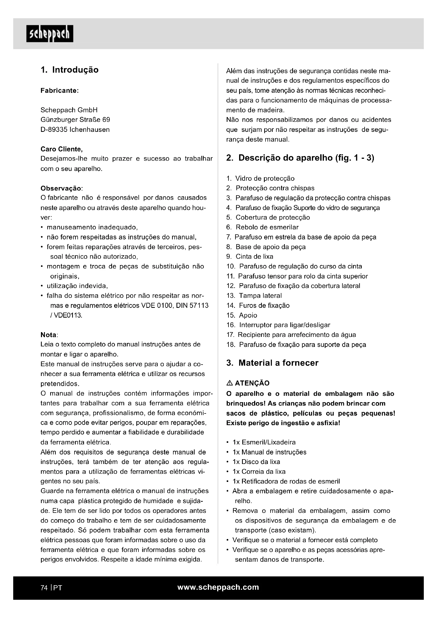 Fabricante: Scheppach GmbH Günzburger Straße 69 D-89335 Ichenhausen Caro Cliente, Desejamos-lhe muito prazer e sucesso ao trabalhar com o seu aparelho. Observação: O fabricante não é responsável por danos causados neste aparelho ou através deste aparelho quando hou- ver: