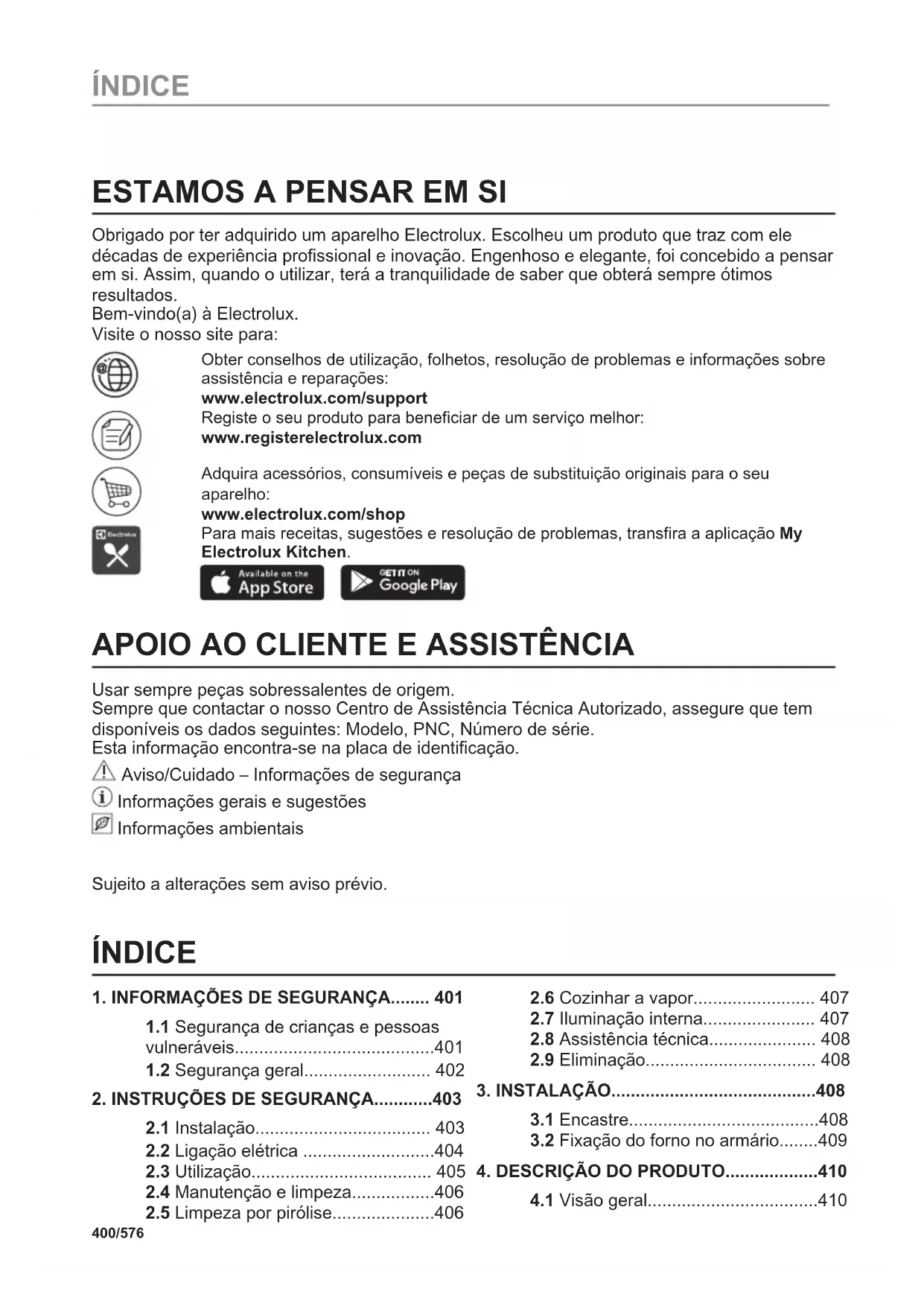 Obrigado por ter adquirido um aparelho Electrolux. Escolheu um produto que traz com ele décadas de experiência profissional e inovação. Engenhoso e elegante, foi concebido a pensar em si. Assim, quando o utilizar, terá a tranquilidade de saber que obterá sempre ótimos resultados. Bem-vindo(a) à Electrolux. Visite o nosso site para: Obter conselhos de utilização, folhetos, resolução de problemas e informações sobre assistência e reparações: www.electrolux.com/support Registe o seu produto para beneficiar de um serviço melhor: www.registerelectrolux.com Adquira acessórios, consumíveis e peças de substituição originais para o seu aparelho: www.electrolux.com/shop Para mais receitas, sugestões e resolução de problemas, transfira a aplicação My Electrolux Kitchen.