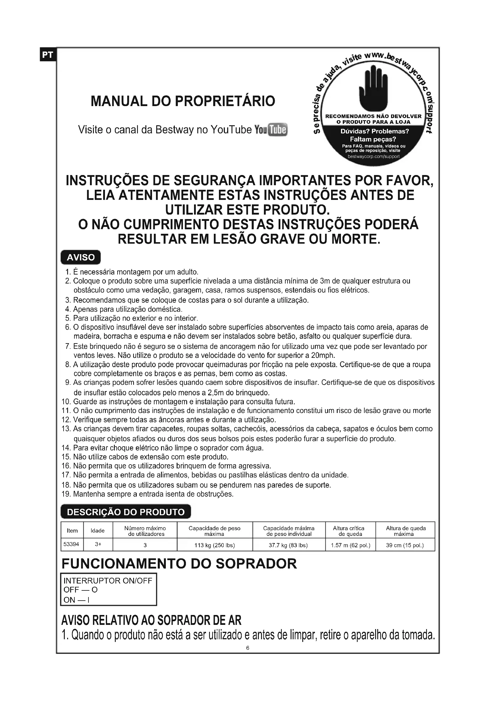 Motor is unable to run normallyINSTRUÇÕES DE SEGURANÇA IMPORTANTES POR FAVOR, LEIA ATENTAMENTE ESTAS INSTRUÇÕES ANTES DE UTILIZAR ESTE PRODUTO. O NÃO CUMPRIMENTO DESTAS INSTRUÇÕES PODERÁ RESULTAR EM LESÃO GRAVE OU MORTE. 1. É necessária montagem por um adulto. 2. Coloque o produto sobre uma superfície nivelada a uma distância mínima de 3m de qualquer estrutura ou obstáculo como uma vedação, garagem, casa, ramos suspensos, estendais ou fios elétricos. 3. Recomendamos que se coloque de costas para o sol durante a utilização. 4. Apenas para utilização doméstica. 5. Para utilização no exterior e no interior. 6. O dispositivo insuflável deve ser instalado sobre superfícies absorventes de impacto tais como areia, aparas de madeira, borracha e espuma e não devem ser instalados sobre betão, asfalto ou qualquer superfície dura. 7. Este brinquedo não é seguro se o sistema de ancoragem não for utilizado uma vez que pode ser levantado por ventos leves. Não utilize o produto se a velocidade do vento for superior a 20mph. 8. A utilização deste produto pode provocar queimaduras por fricção na pele exposta. Certifique-se de que a roupa cobre completamente os braços e as pernas, bem como as costas. 9. As crianças podem sofrer lesões quando caem sobre dispositivos de insuflar. Certifique-se de que os dispositivos de insuflar estão colocados pelo menos a 2,5m do brinquedo.10. Guarde as instruções de montagem e instalação para consulta futura.11. O não cumprimento das instruções de instalação e de funcionamento constitui um risco de lesão grave ou morte12. Verifique sempre todas as âncoras antes e durante a utilização.13. As crianças devem tirar capacetes, roupas soltas, cachecóis, acessórios da cabeça, sapatos e óculos bem como quaisquer objetos afiados ou duros dos seus bolsos pois estes poderão furar a superfície do produto.14. Para evitar choque elétrico não limpe o soprador com água.15. Não utilize cabos de extensão com este produto.16. Não permita que os utilizadores brinquem de forma agressiva.17. Não permita a entrada de alimentos, bebidas ou pastilhas elásticas dentro da unidade.18. Não permita que os utilizadores subam ou se pendurem nas paredes de suporte.19. Mantenha sempre a entrada isenta de obstruções.