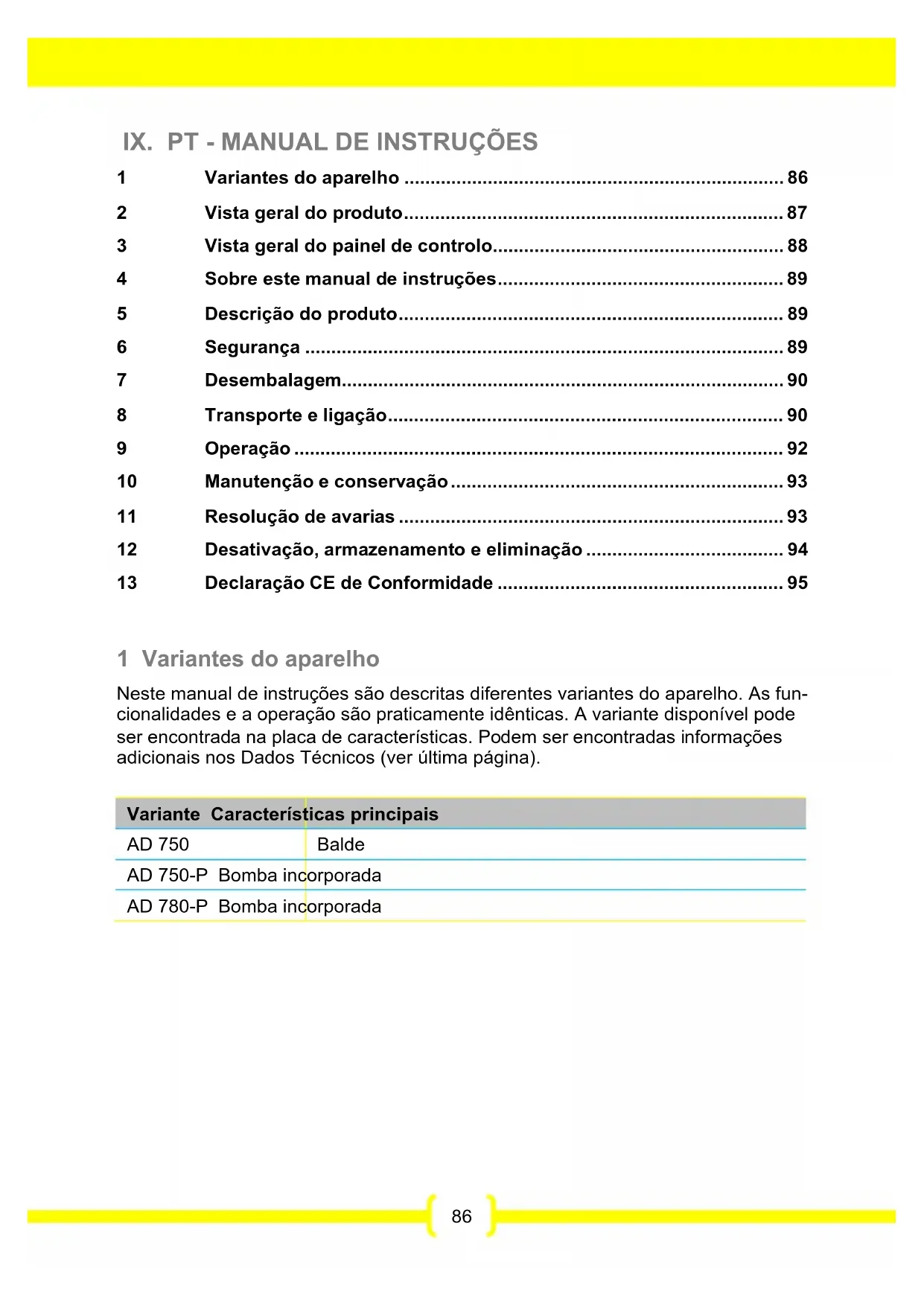 - 13 Declaração CE de Conformidade 1 Variantes do aparelho Neste manual de instruções são descritas diferentes variantes do aparelho. As fun- cionalidades e a operação são praticamente idênticas. A variante disponível pode ser encontrada na placa de características. Podem ser encontradas informações adicionais nos Dados Técnicos (ver última página). Variante Características principais AD 750 Balde AD 750-P Bomba incorporada AD 780-P Bomba incorporada87 2 Vista geral do produto Fig. 1: Vista dianteira p. 95
