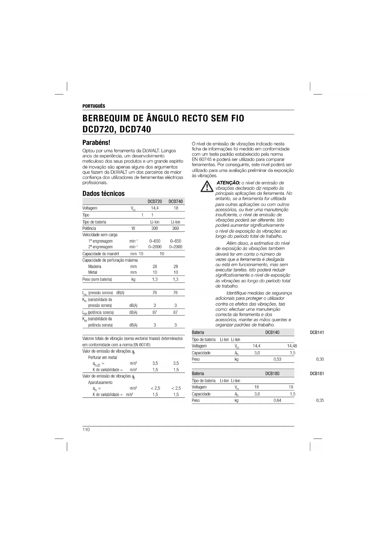 DCD720, DCD740 O nível de emissão de vibrações indicado nesta ficha de informações foi medido em conformidade com um teste padrão estabelecido pela norma EN 60745 e poderá ser utilizado para comparar ferramentas. Por conseguinte, este nível poderá ser utilizado para uma avaliação preliminar da exposição às vibrações. ATENÇÃO: o nível de emissão de vibrações declarado diz respeito às principais aplicações da ferramenta. No entanto, se a ferramenta for utilizada para outras aplicações ou com outros acessórios, ou tiver uma manutenção insuficiente, o nível de emissão de vibrações poderá ser diferente. Isto poderá aumentar significativamente o nível de exposição às vibrações ao longo do período total de trabalho. Além disso, a estimativa do nível de exposição às vibrações também deverá ter em conta o número de vezes que a ferramenta é desligada ou está em funcionamento, mas sem executar tarefas. Isto poderá reduzir significativamente o nível de exposição às vibrações ao longo do período total de trabalho. Identifique medidas de segurança adicionais para proteger o utilizador contra os efeitos das vibrações, tais como: efectuar uma manutenção correcta da ferramenta e dos acessórios, manter as mãos quentes e organizar padrões de trabalho. Bateria DCB140 DCB141 Tipo de bateria Li-Ion Li-Ion Voltagem V